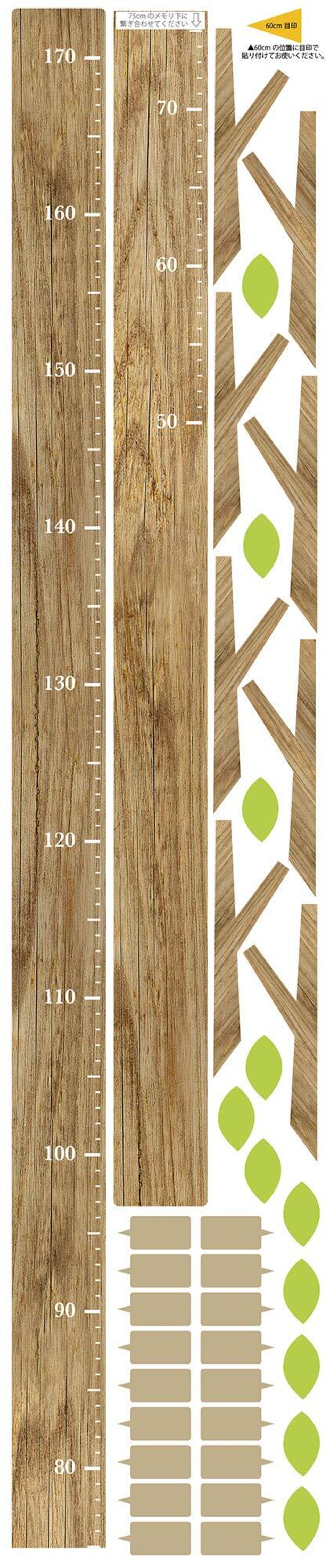 シンプルに使いたい方は身長計本体だけを貼って、インテリアとしても楽しみたい方は本体に枝と葉をつけて木のようにしてもおしゃれです。身長や名前の記録も、 矢印の記録シールを使っても、葉を使ってもどちらでもお好みでお使いいただけます。自由に書き込める矢印記録シールは18枚、葉のシールは11枚付き。 安心の日本製