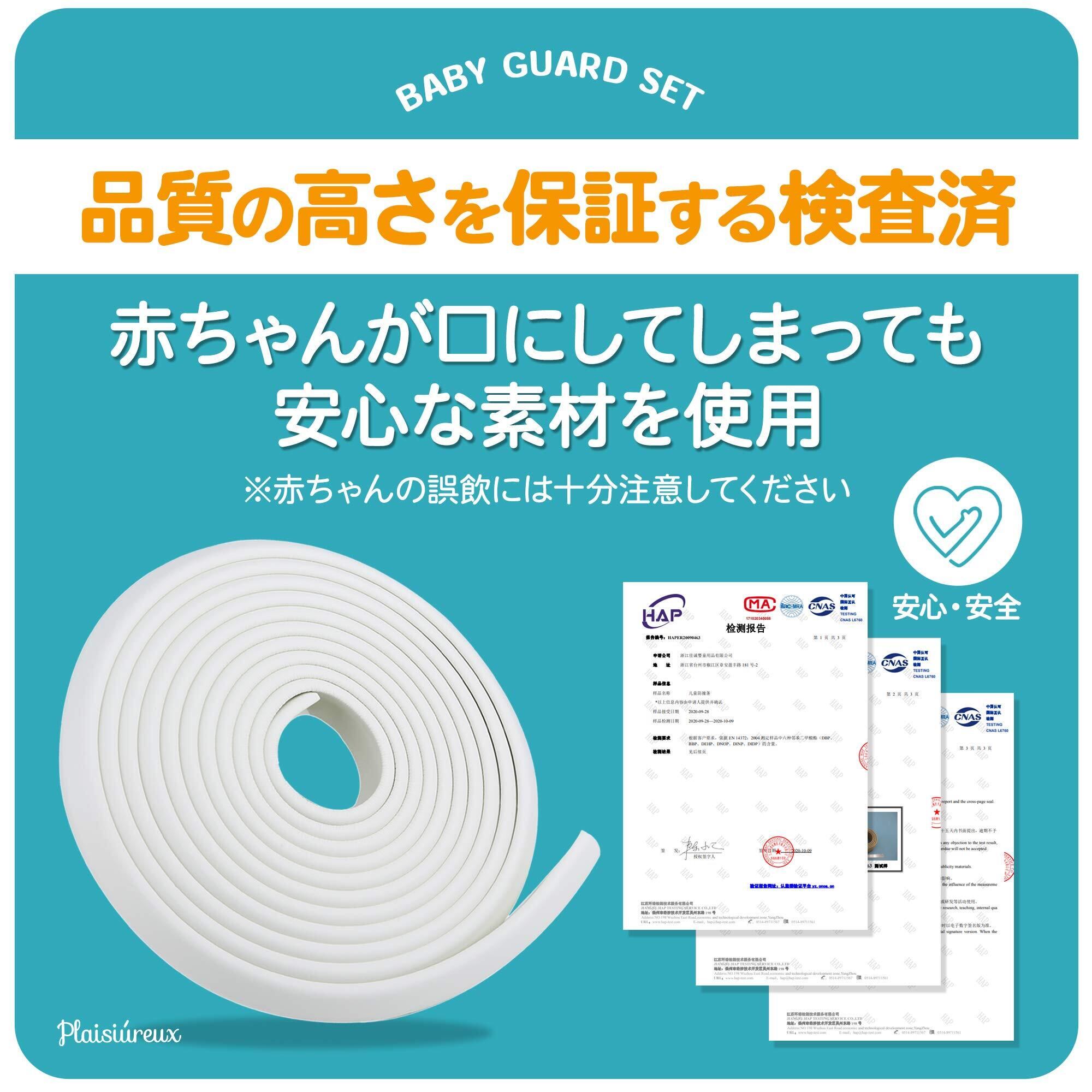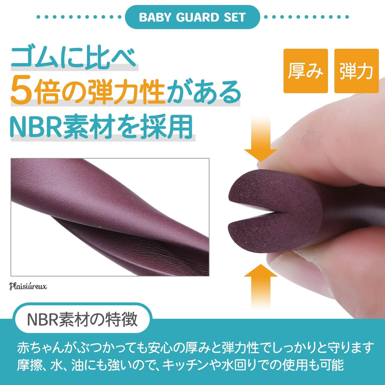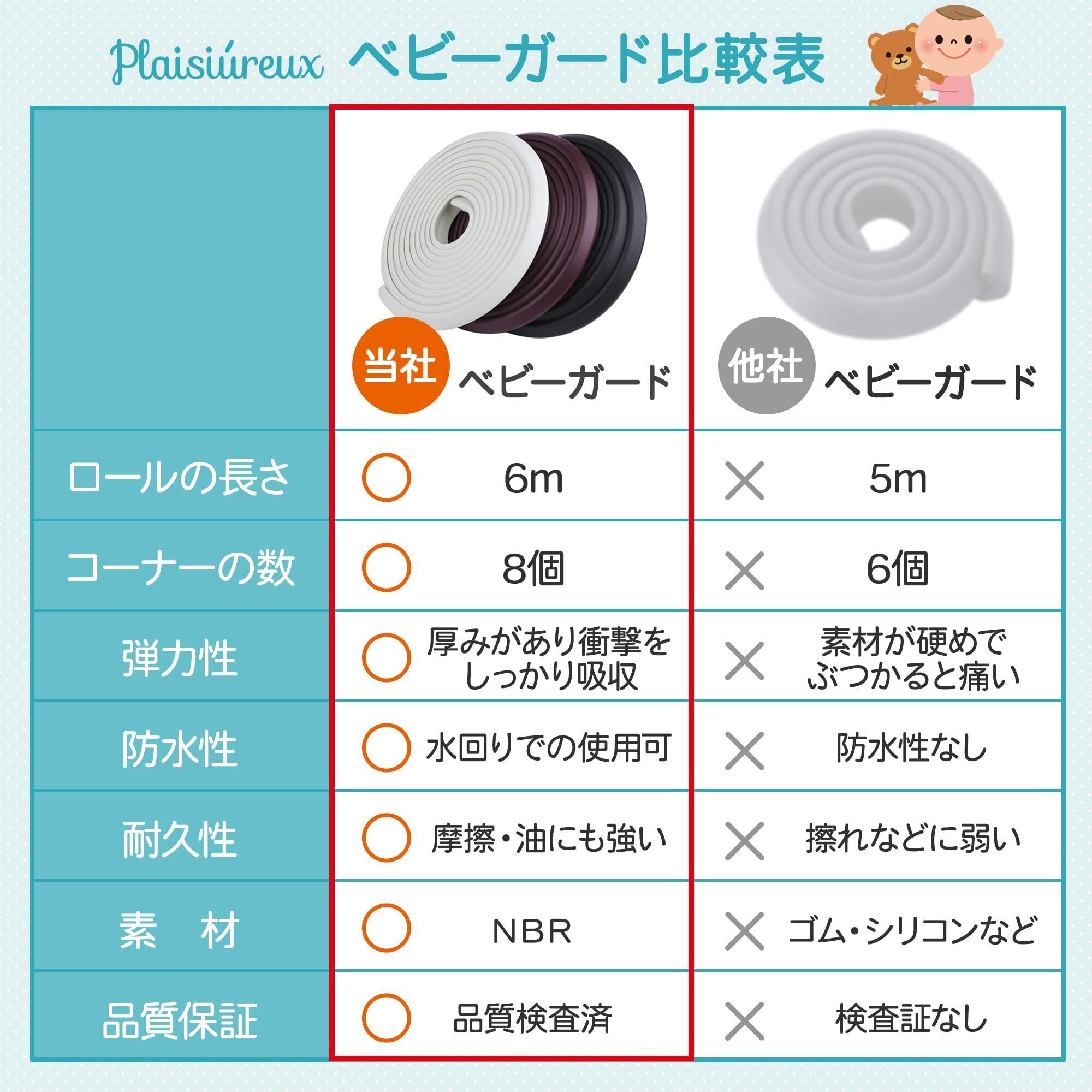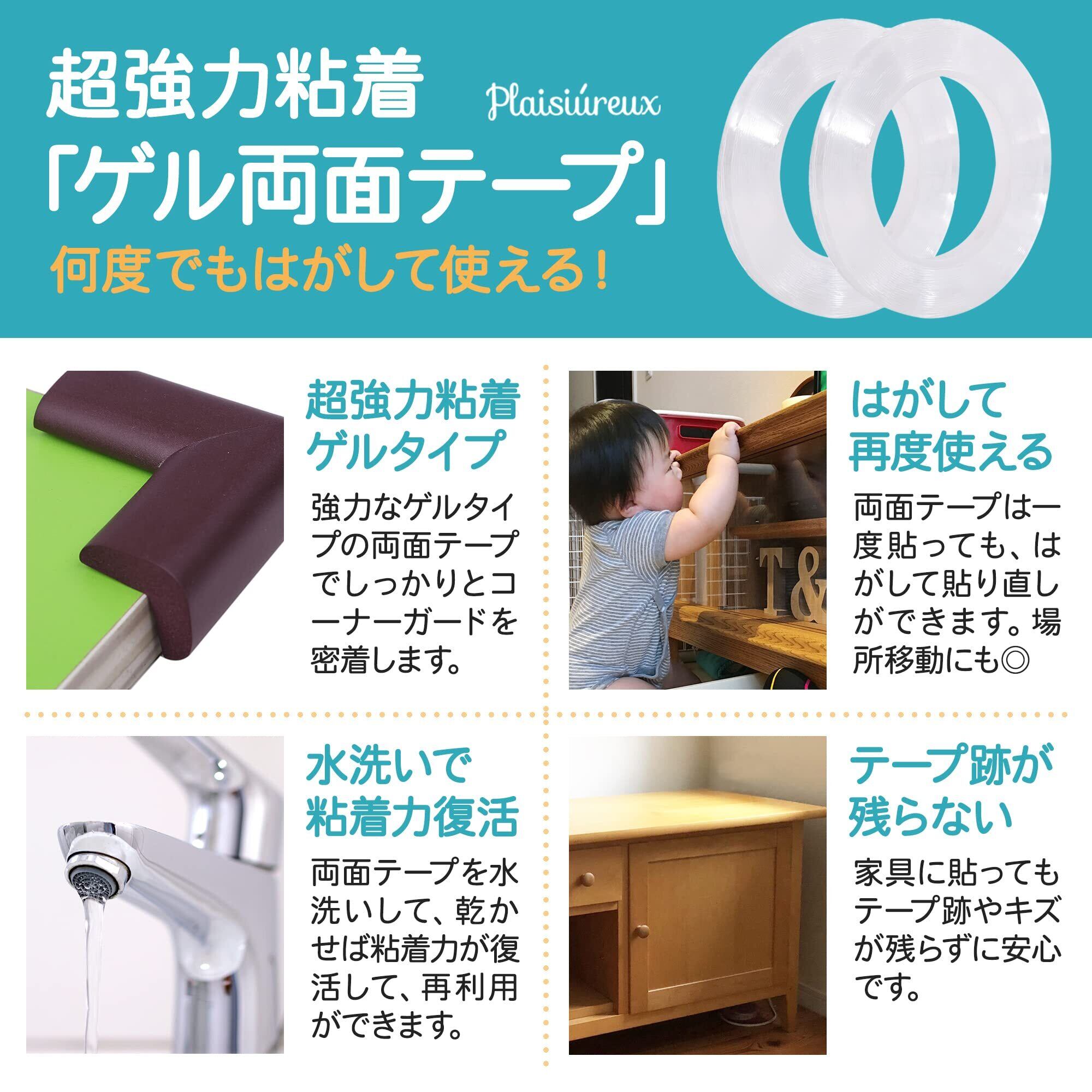 【商品仕様】○取付方法:①貼り付ける場所の長さにカットします ②内側に両面テープを貼ります ③両面テープのはく離紙をはがします ④端からおさえながら貼り付けます ○カラー:ホワイト、ブラウン、ブラック ○サイズ:ベビーガード6m、コーナー8個、ゲル両面テープ(幅1センチ×7メートル)2個 コーナー クッション: 6m×2.3cm×0.8cmコーナーガード: 5.5cm×2.3cm×0.8cm○素材:NBR ○ブランド:Plaisiureux(プレジュール)