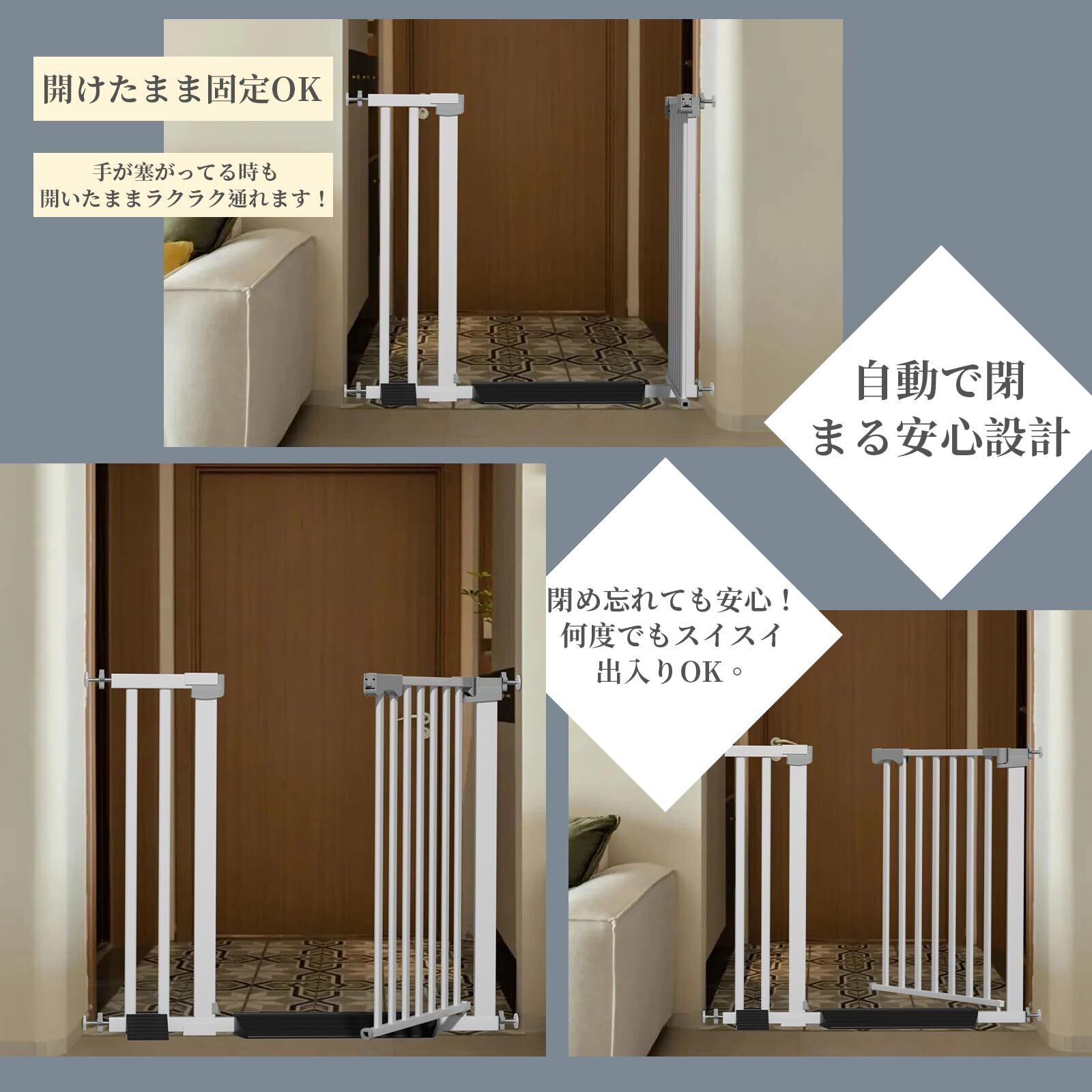 【自動閉扉&90°固定:家事中のうっかり防止】開閉角度90°未満で自動閉扉、90°で固定解放(食材運搬に便利)。育児と家事で忙しい時も、階段・キッチンへの侵入を自動ガード!