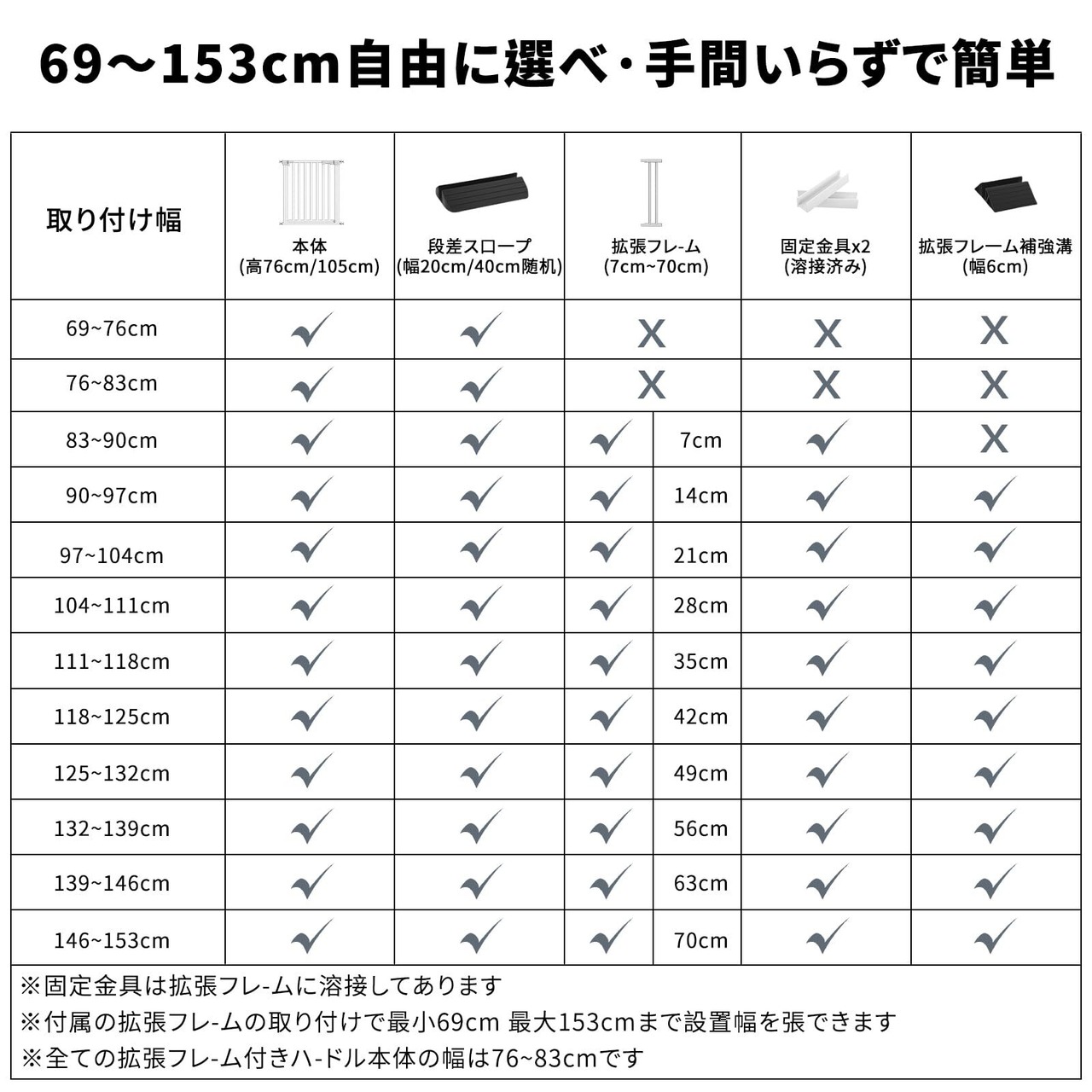 【幅調整自由&全配件付属:69-153cm柔軟対応】拡張フレーム(7-70cm) 付属で階段上・キッチン入口など幅153cmまで対応。他社で別売の「段差スロープ」「補強溝(90cm以上付き)」「溶接固定金具(溶接は延長)」を全付属!壁傷防止パッド(別売)やY型ボルト(別売)で柱状階段も設置可。