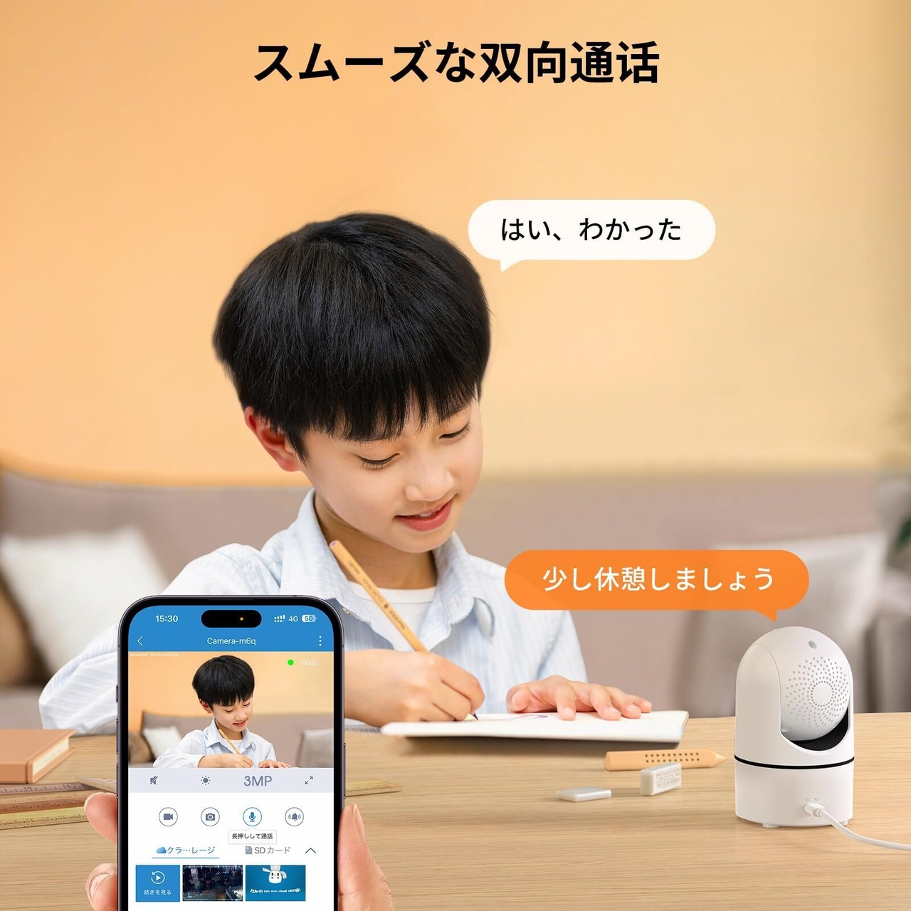 【双方向会話・alexa対応・複数ユーザー共有・取り付け/操作簡単】本ネットワークカメラには、高感度集音マイクと上質スピーカーが内蔵されていて、海外や出張先など遠い所でも、リアルタイムでお留守番中の子供や介護のお年寄りと会話したり、ペットに声をかけたりする可能です。Alexaにも対応し、Alexaに話しかけるだけでカメラの映像を確認できます。1台のカメラを複数の家族や友達で使い分けたい場合には、直接にQRコードをスキャンして、共有が可能です。それ以外、設置方法もとても簡単で、本体をそのまま置いて使うこともできますし、ネジで天井に設置することも可能です。また、カメラ接続方法もアプリ操作も、初心者でも楽に使いこなせます。(日本語説明書付属:英語、フランス語、イタリア語、ドイツ語、スペイン語、日本語の6ヶ国語に対応しています。最後の方に日本語でちゃんとした案内があるのでそちらをよく読んでください。)