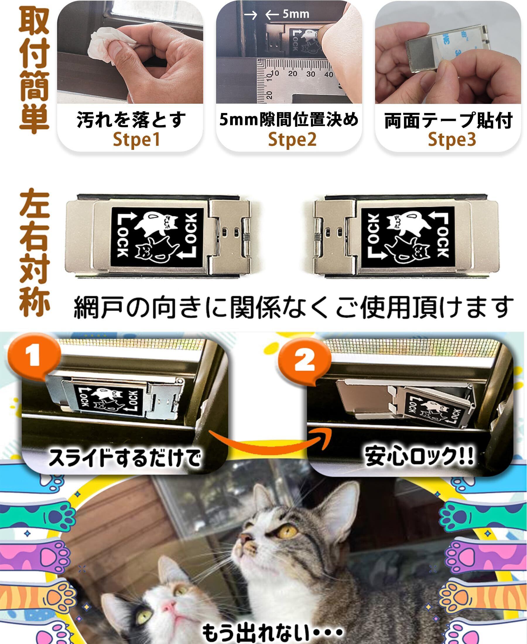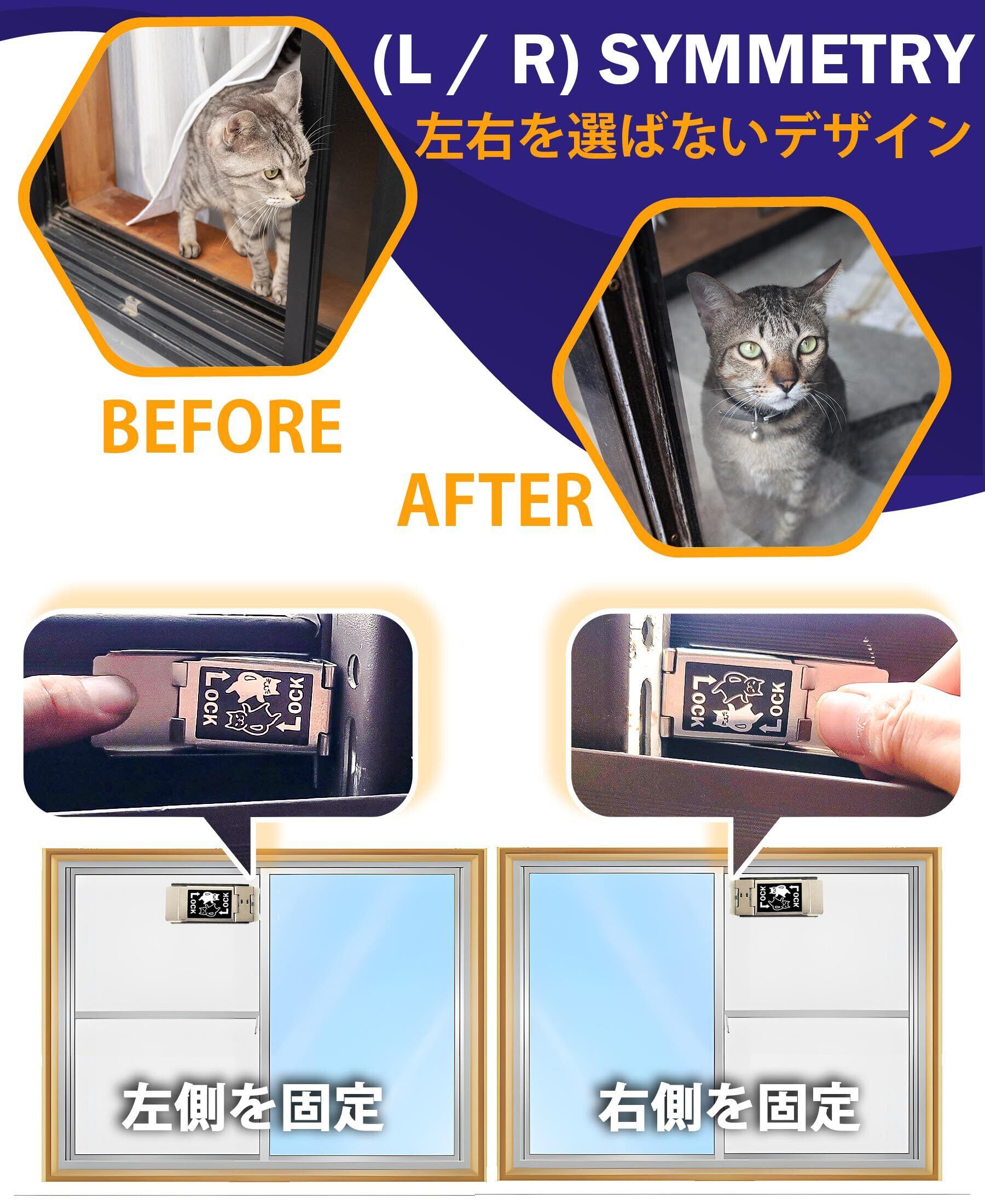 網戸ロック 猫が脱出を諦める 網戸ストッパー 猫脱走防止 補助錠 左右対称デザイン かわいいネコのステッカー付き 窓ロックストッパー 子供安全ロック サッシロック 窓 防犯ストッパー (2個セット)