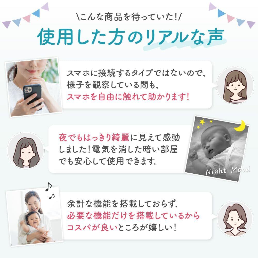 【音センサーで異変をすぐ確認】 赤ちゃんのぐずり泣きや寝ている部屋で物音がしたら、自動的に画面を起動し、離れた部屋にいる赤ちゃんの様子の変化をモニター機で確認することができます。必要がないときは、オフにすることもでき赤ちゃんとパパママに安心とゆとりの時間をつくります。