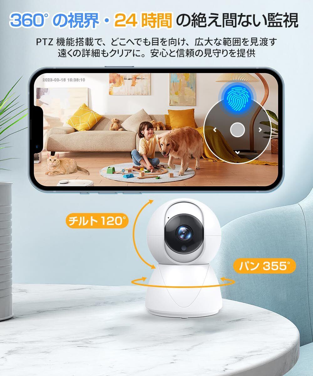 【パン355°&チルト120°、広範囲をカバー】 防犯カメラ 室内 で上下左右に自由自在な首振り機能で、死角のない360°見守りを実現できる ペットカメラ iphone対応 となり、リビングや寝室の隅々まで確認可能、遠隔操作もスムーズ。 監視カメラ 留守中のペットや子どもの様子をいつでもチェックできます。