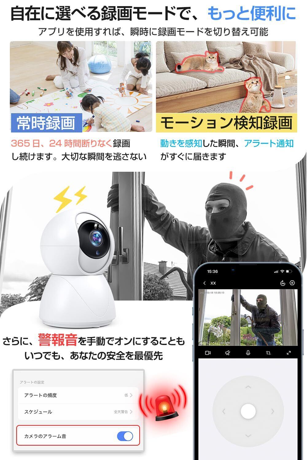 【モーション検知&アラート通知&双方向通話】この 防犯カメラ が動きを感知すると即座にスマホに通知。録画開始と同時に音声アラームも可能な 見守り カメラ です。双方向通話機能でペットや子どもに声かけもできるため、トラブルの早期発見と対応が可能な スマートカメラ です。