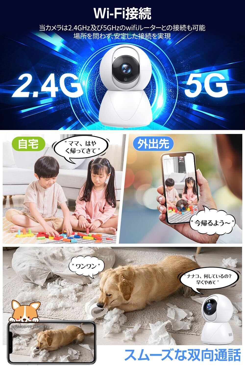 【2.4GHz&5GHz両対応、安定した通信環境】 みまもりカメラ がWiFiは2.4G/5G両対応、ルーターとの接続も安定。外出先からもスマホで簡単に接続し、リアルタイム映像や録画の確認が可能 室内カメラ 。外でも家の様子を見守れる安心感。