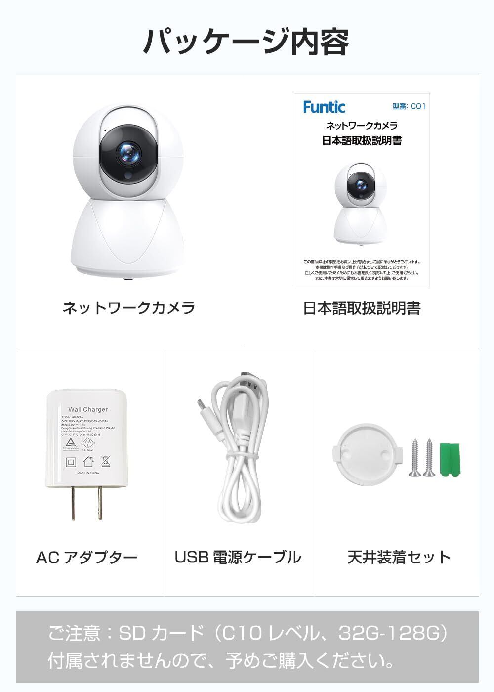 ご注意:この 監視カメラ にはSDカードが付属しておりません。 映像の記録には、最大128GBまで対応するSDカードが必要となりますので、ご使用になる前に別途ご用意ください。