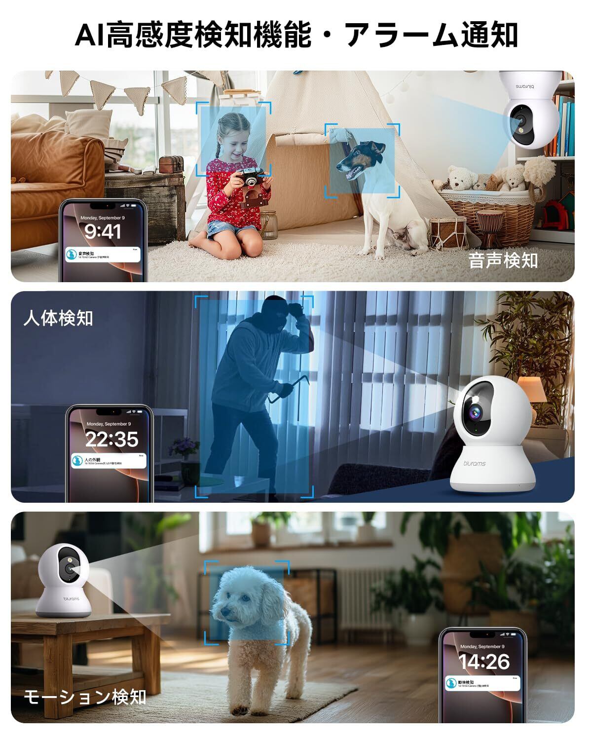 【AIモーション検知・警報通知・自動追跡】この室内カメラは、高精度なモーション、音声、人体検知センサーが搭載されており、動きを感知した瞬間にスマホに警報通知を送信します。アプリ内で自動追跡機能をオンにすると、動く対象を追い続け、カメラが自動で水平・垂直に動き、視界を逃すことなく監視できます。また、先進的なAIセンサーサービス(有料オプション)を搭載しており、高齢者やペットの見守り、車両監視など、さまざまなシーンで活用できます。