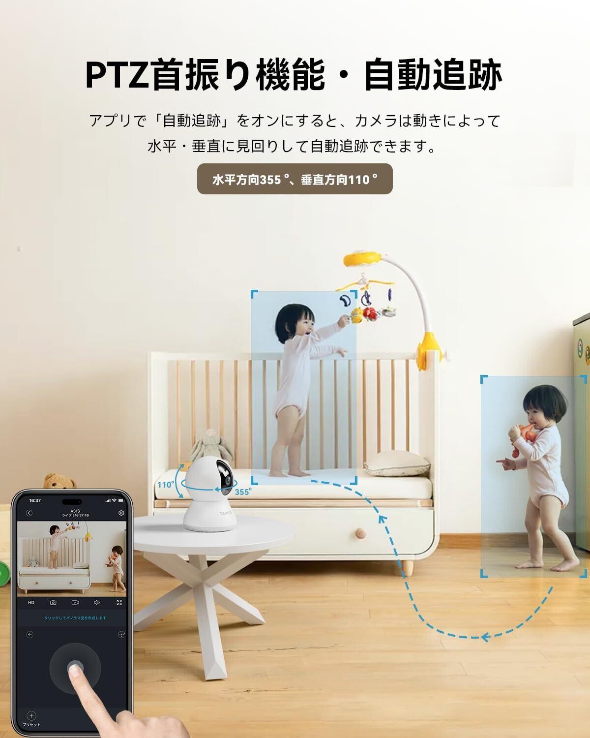 【PTZ首振り機能・ 双方向会話】水平方向360°、垂直方向110°のPTZ機能が搭載しており、アプリでネットワークカメラの向きを遠隔操作でき、360°自由に回転させて、どこからでもご家族やペットを見守ることができます。4倍デジタルズーム機能で気になる部分を拡大して詳細に確認することもできます。さらに、アプリでリアルタイムの双方向音声通話が可能です。ペットの様子を見守る際や、介護が必要な高齢者のケア、オフィス内の監視など、様々なシーンで活躍します。