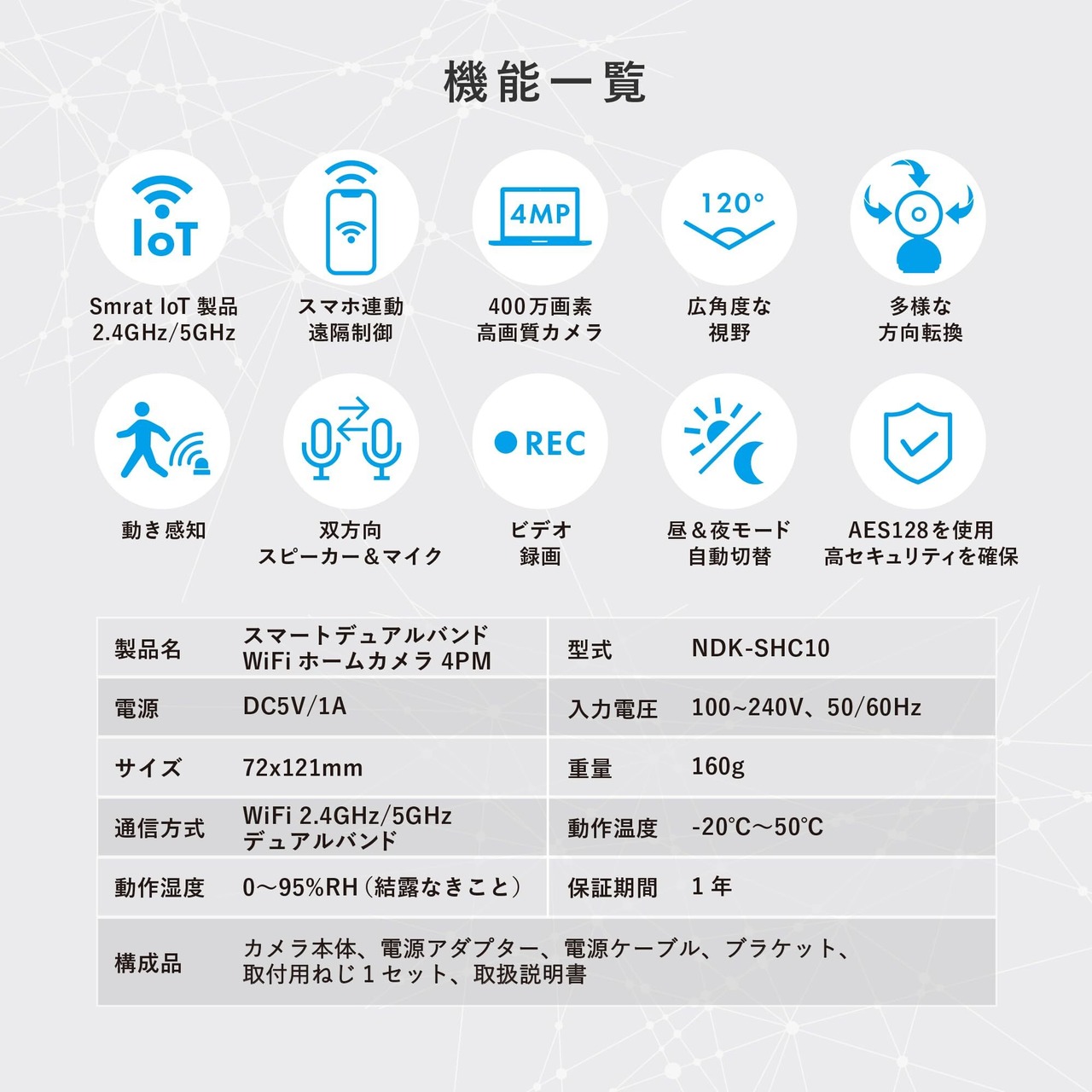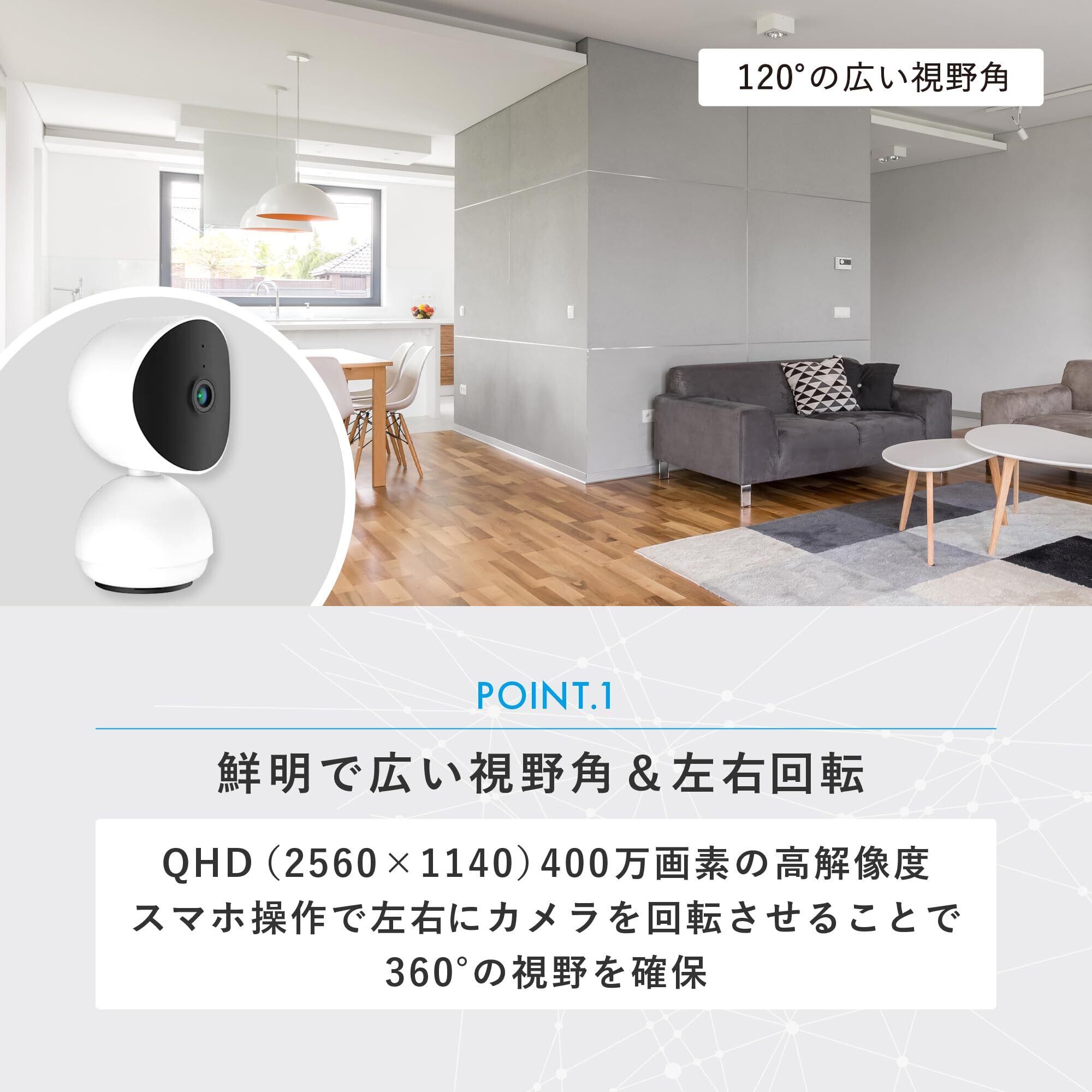 QHD(2560×1140)高解像度の400万画素でより広角な視野と鮮明な画像を提供します。夜間モードへの自動切換(IRナイトビジョン機能:自動の設定)搭載で部屋が暗くても安心です。 (IRナイトビジョン機能:【ON】の場合は周囲の明るさに関わらずIRナイトビジョンモードでの動作となり、画面が常時白黒になります。【OFF】の場合は周囲の明るさに関わらず、画面が常時カラーになります。周囲が暗い場合には、画面が暗くなることがあります。) AES128を使用しており高セキュリティを確保しています。