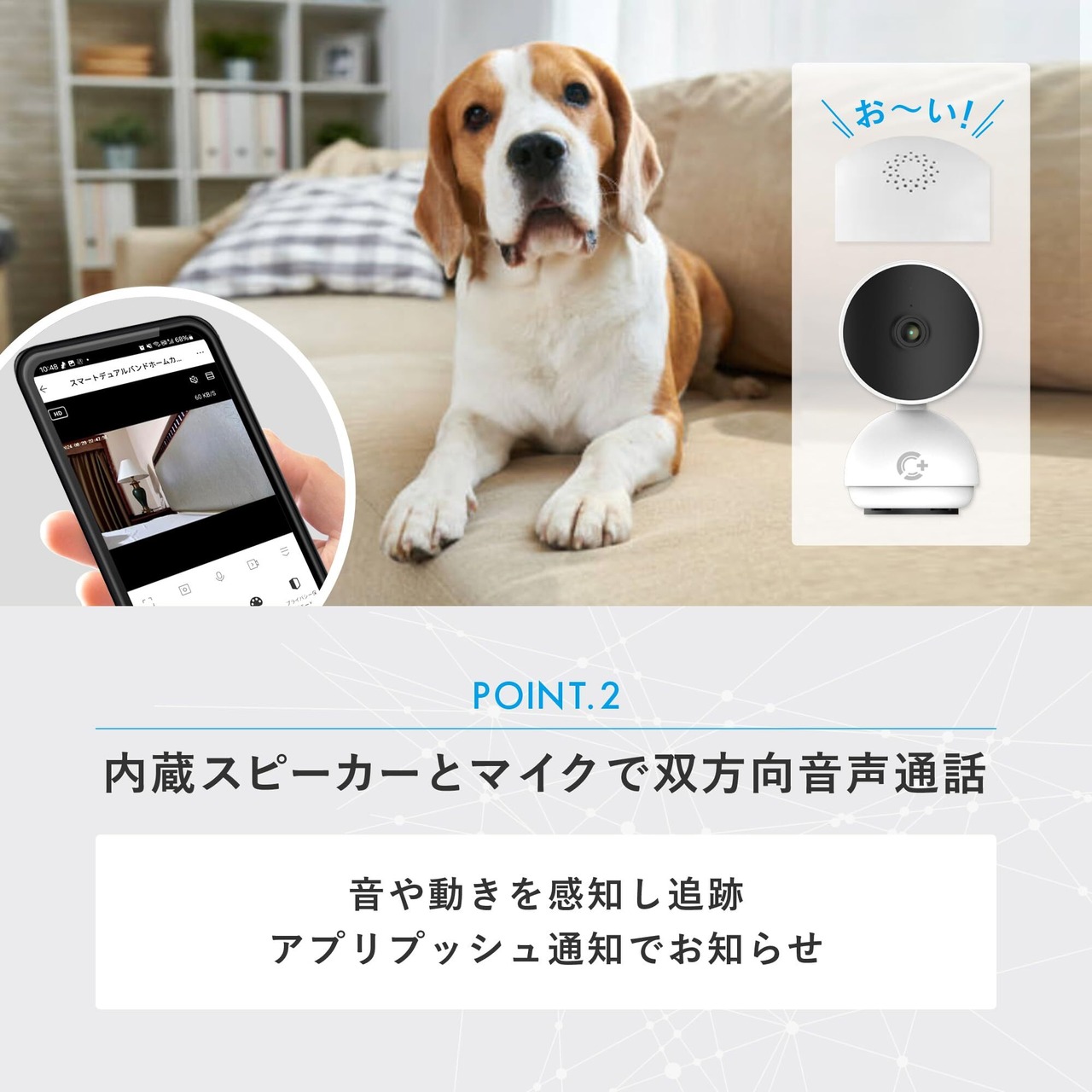 内蔵スピーカーとマイクで双方向音声通話することができます。 通話方式を「片方向通話」「双方向通話」から選択できます。「双方向通話」の設定で、スマートフォンに向かって話すとカメラ内蔵スピーカーから音声が出てリアルタイムで通話ができます。