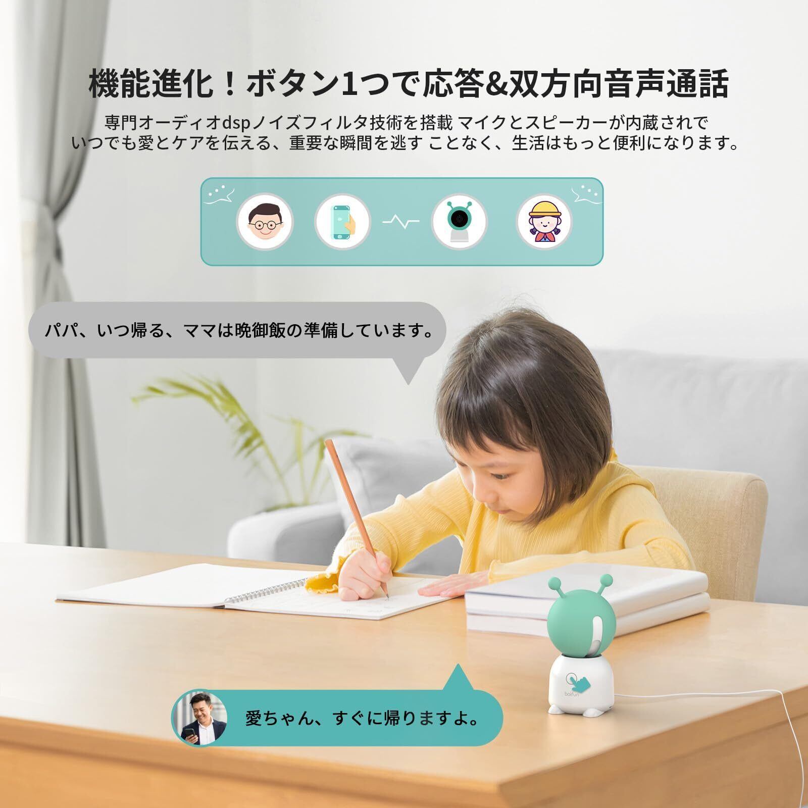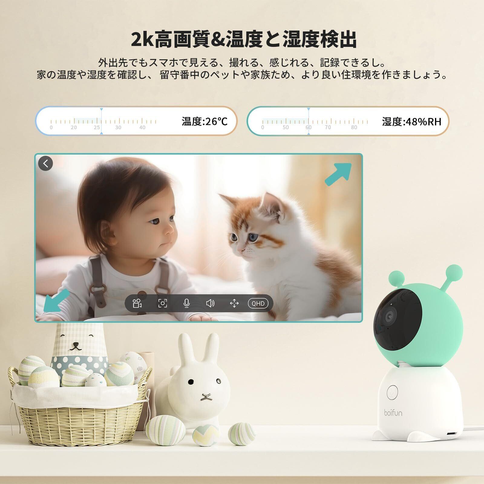 【2k高画素・全方位監視・スマホ連動・自動追尾・不可視赤外線暗視】BOIFUN はユニークでかわいい外観であり見守りカメラが新登場!当社の室内用監視カメラは120度超広角レンズで広い範囲を2k(300万)高画質に撮影可能です。BOIFUN・ペットカメラはスマホ連携して水平355°、垂直60°に操作できる超静音の首振り搭載します。高い所に登る猫やモモンガや、行動範囲の広い犬の留守番の監視や見守りが向いています。boifunペットカメラは自動追跡であり、監視範囲内の動きを自動に追尾しながら録画してスマホへ警報を送ります。( 注意:カメラは上下に追尾できません。事前に追跡機能をオンにしてください。)夜に赤ちゃんの顔をきれいに見えます。アプリに赤外線ランプをオフできるし、赤ちゃんの眠りを妨げません!iPhone/iOS/Androidスマホ連動、タブレット対応