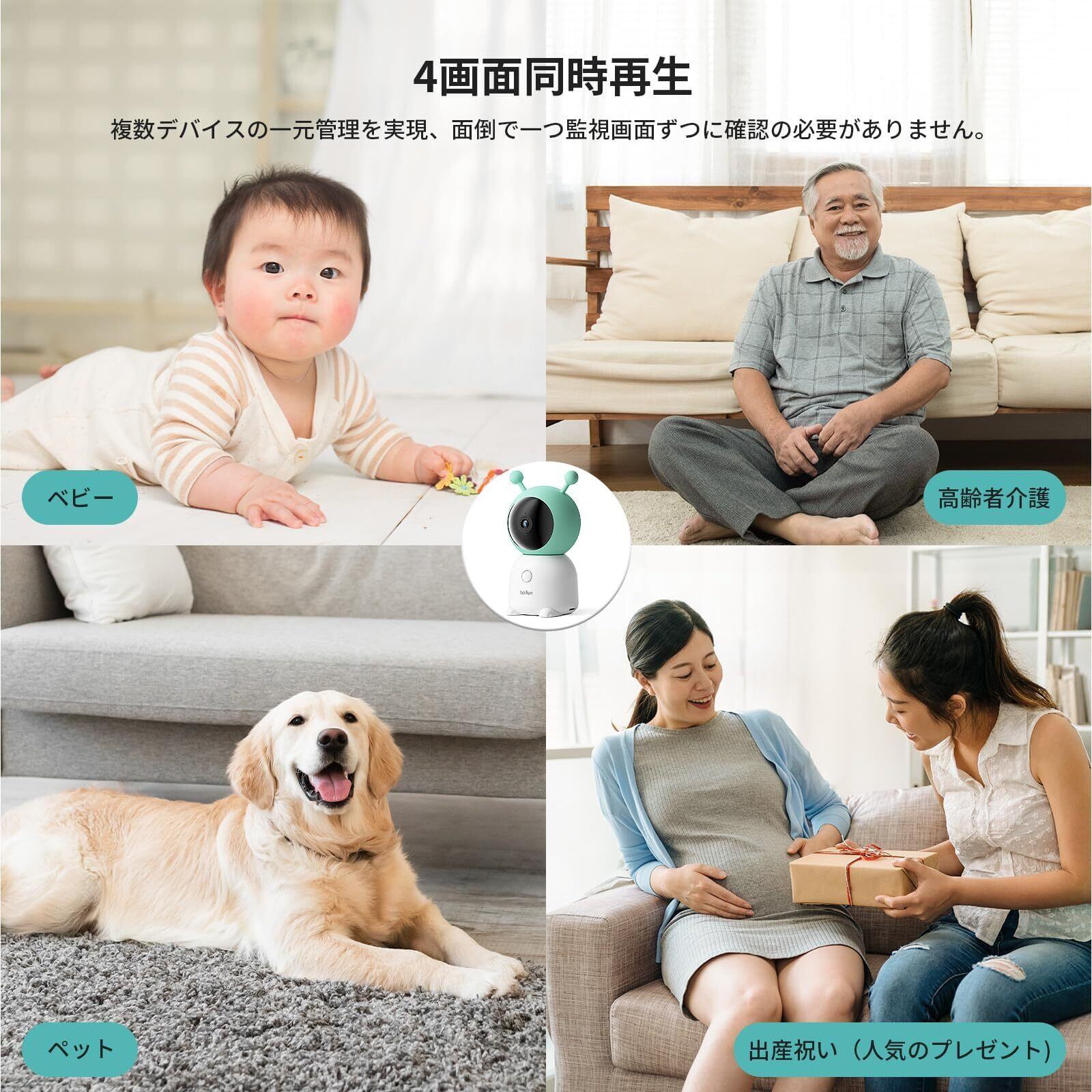 【ボタン1つで応答・双方向音声通話・4画面同時再生・リモート監視off・プライバシー保護】:BOIFUN留守番カメラはマイクとスピーカーがついているため、スマホ側とカメラ側で通話を行う事ができます。カメラ本体の通話ボタンを押すと、見守り者のスマホに呼び出して会話ができます。一人暮らしの両親や親戚などの高齢者やお留守番の子供には大変便利な機能です。BoifunCamアプリにて監視カメラのレンズをonやoffや定時的に起動にも可能です。監視カメラのレンズは外出時に、遠隔にoffでしてから、カメラが機能しないので何も映らなくなります。マイクやスピーカーにもoffされます。4や9分割画面で手間や時間を省いた、複数台カメラを連動できます。1つ画面で4つのカメラの映像を一度に確認できます。屋内ネットワークカメラでも屋外でも、同じアプリを使用したカメラをまとめて管理できます。アプリ:BoifunCamとCloudEdge