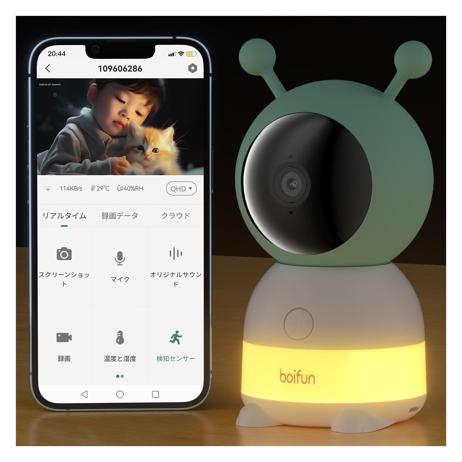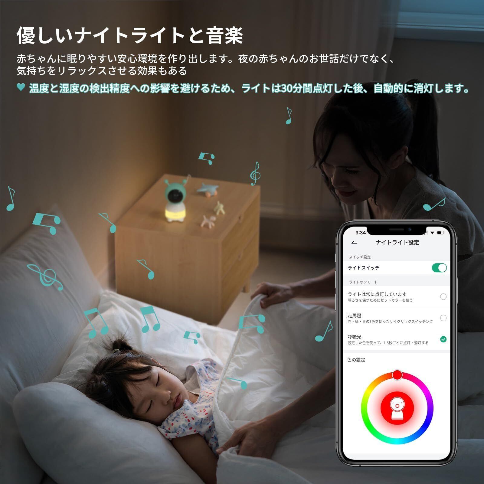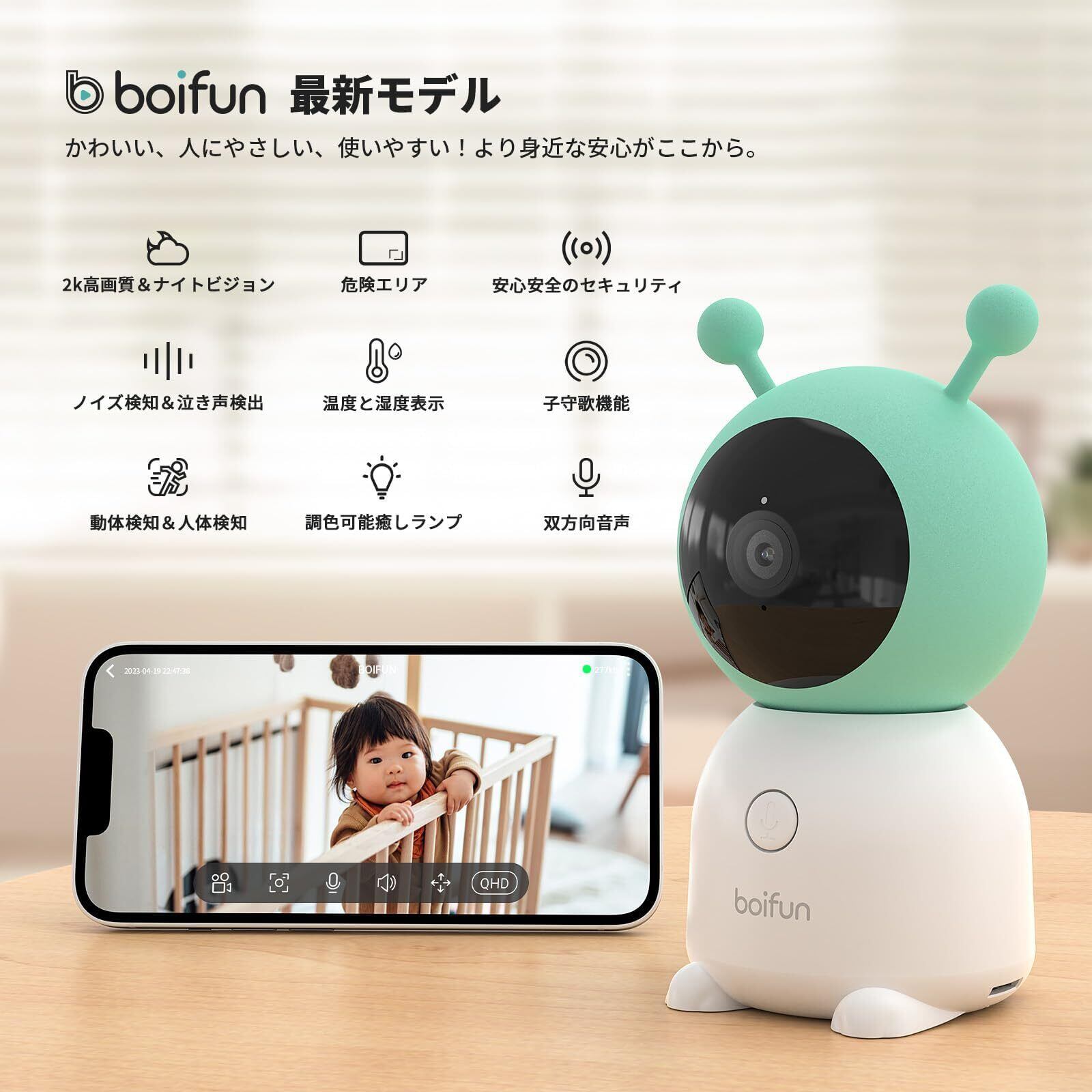 【癒す夜間ランプ・子守歌・最新BOIFUNアプリ・取り付け簡単】調色可能の癒す夜間ランプがあるため、赤ちゃんの夜のお世話に最適な光量ライトであり、快適にお世話ができます。ベビーカメラは30分の自動オフタイマー機能もあり、消し忘れを防げます。ベビーカメラから子守歌(14曲)が流れます。寝かしつけにも頼れるベビーカメラです。出産祝いにぴったりなプレゼントです。BOIFUNベビーカメラで家事や仕事と育児の両方が楽になります。新米のママとパパをもっと自由になります。BoifunCamアプリは簡単かつ使いやすいです。防犯カメラの接続も簡単です。QRコードを読み取るだけで防犯カメラが接続できるようにしっました!工事不要で初心者の方でもストレスなく快適にご使用いただけます。置く、天井、壁掛け、三脚やベビーカメラスタンドとの取り付け可能!