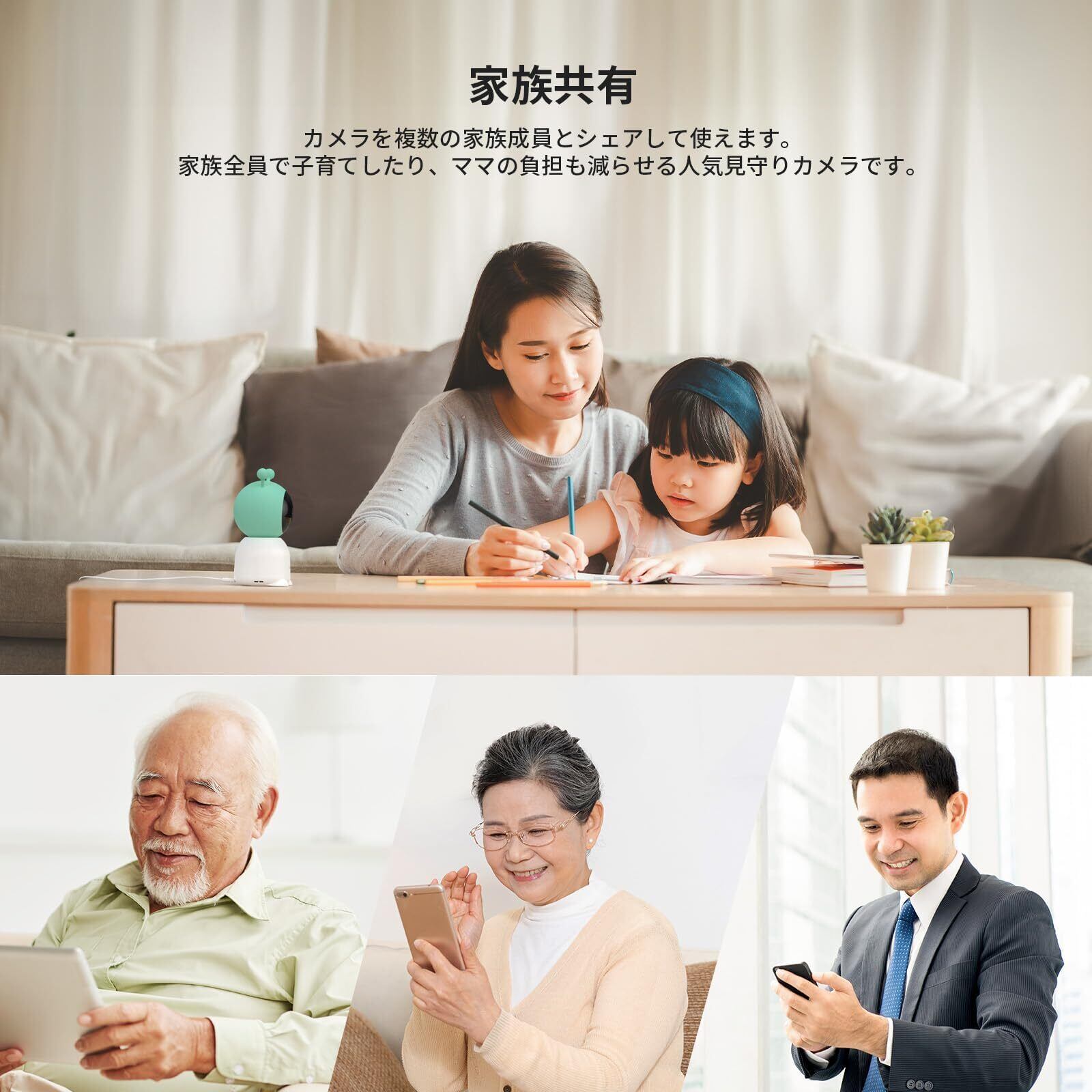 【動体・人体・異常音・泣き声・温度と湿度センサーが搭載・家族共有】動体センサーをオンにすると、監視カメラの撮影範囲内で人や車や動物の動きを検知します。人体検知には、人型の動きのみを検知します。異常音センサーには、防犯カメラの側の異常音を検知します。泣き声センサーには、赤ちゃんの泣き声のみを検知して、スマホに「泣く」と表示して通知します。お留守番中の愛犬や愛猫を見守りできる「BOIFUNペットカメラ」は温度と湿度センサーが内蔵されたので、カメラのアプリで室内の温度・湿度がわかります。熱中症対策など健康と安全を考える飼い主さんに人気ペットカメラです。(温度と温度設定・通知機能がありません。)ネットワークカメラを複数の家族成員とシェアして使えます。家族全員で子育てしたり、ママの負担も減らせる人気見守りカメラです。画面回転:カメラを天井や壁に取り付けた場合、映像の上下が反転します。「スクリーンフリップ」の設定を行うことで、正常にご視聴いただけます。