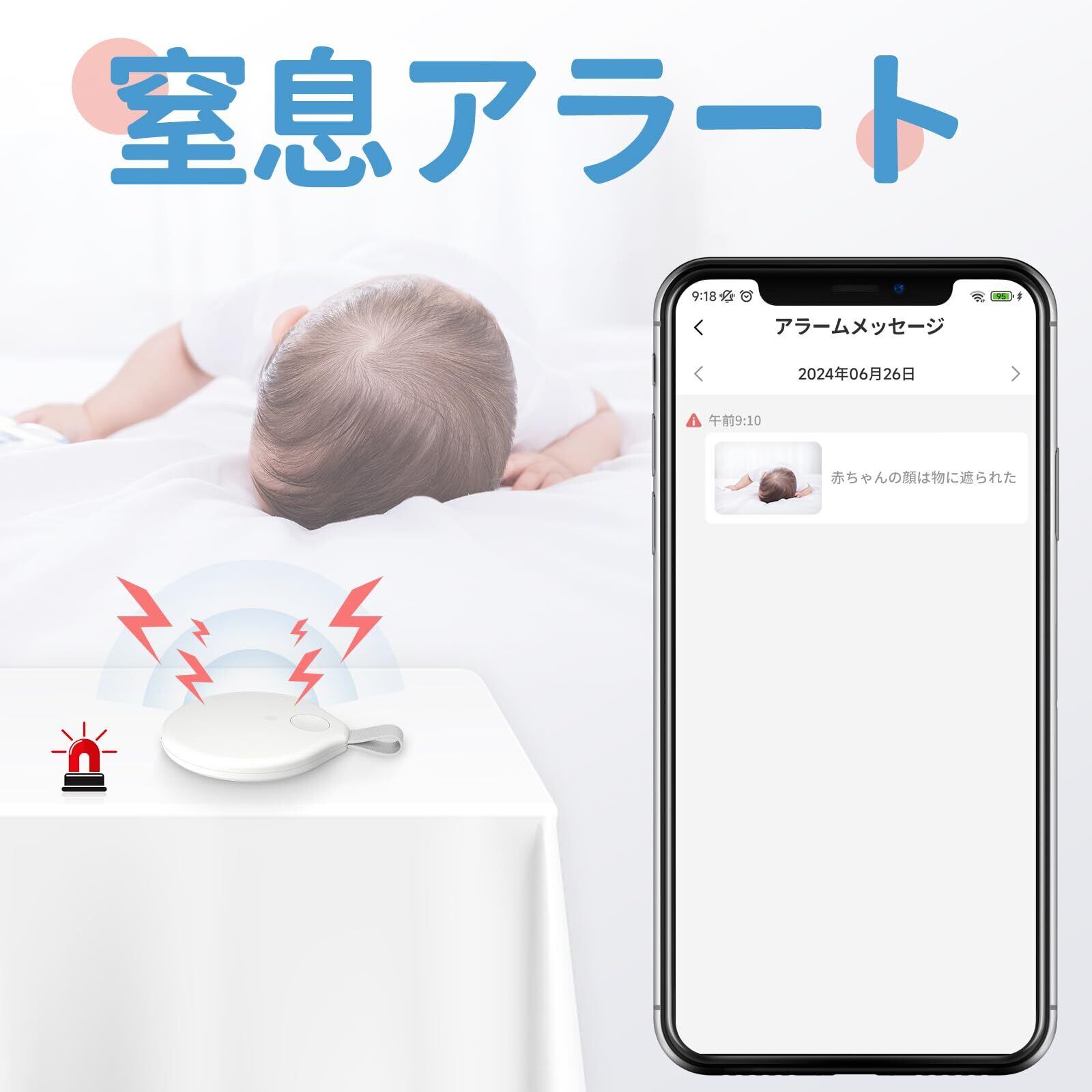 【リアルタイムで赤ちゃんの安全を見守り】窒息警報&呼吸異常感知:先端のAI人工知能技術を駆使して、窒息や呼吸異常など赤ちゃんの睡眠に潜む危険を感知。異常を検知した場合はブザーやBecky Ai APPでお知らせします。
