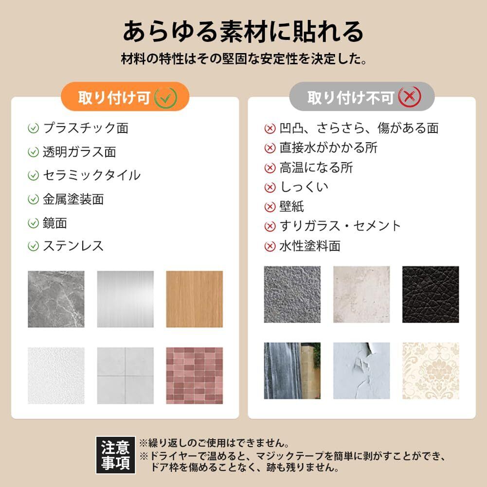 【簡単な取り付け、工具不要】 取り付けには工具やドリルは一切不要です。強力な面ファスナーを使って、扉に簡単に取り付けられます。取り付け前にドア枠を清掃するだけで、しっかりと固定され、簡単に取り外しも可能です。標準的なドア、風防ドア、内装ドアなど、さまざまなドアに対応しています。