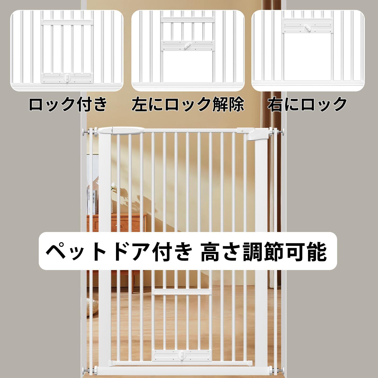 【ペットドア付き】ベビーゲートには小型のペット用ドアが搭載されており、猫や小型犬が自由に通り抜けできます。ベビーゲートにはロック機能付きで、ドアの開閉高さは調整可能。不要な時は完全に閉じることも可能です。ロック機能を含む、ペットドア付き、ベビーゲートは赤ちゃんやペットがいる家庭に適しています。