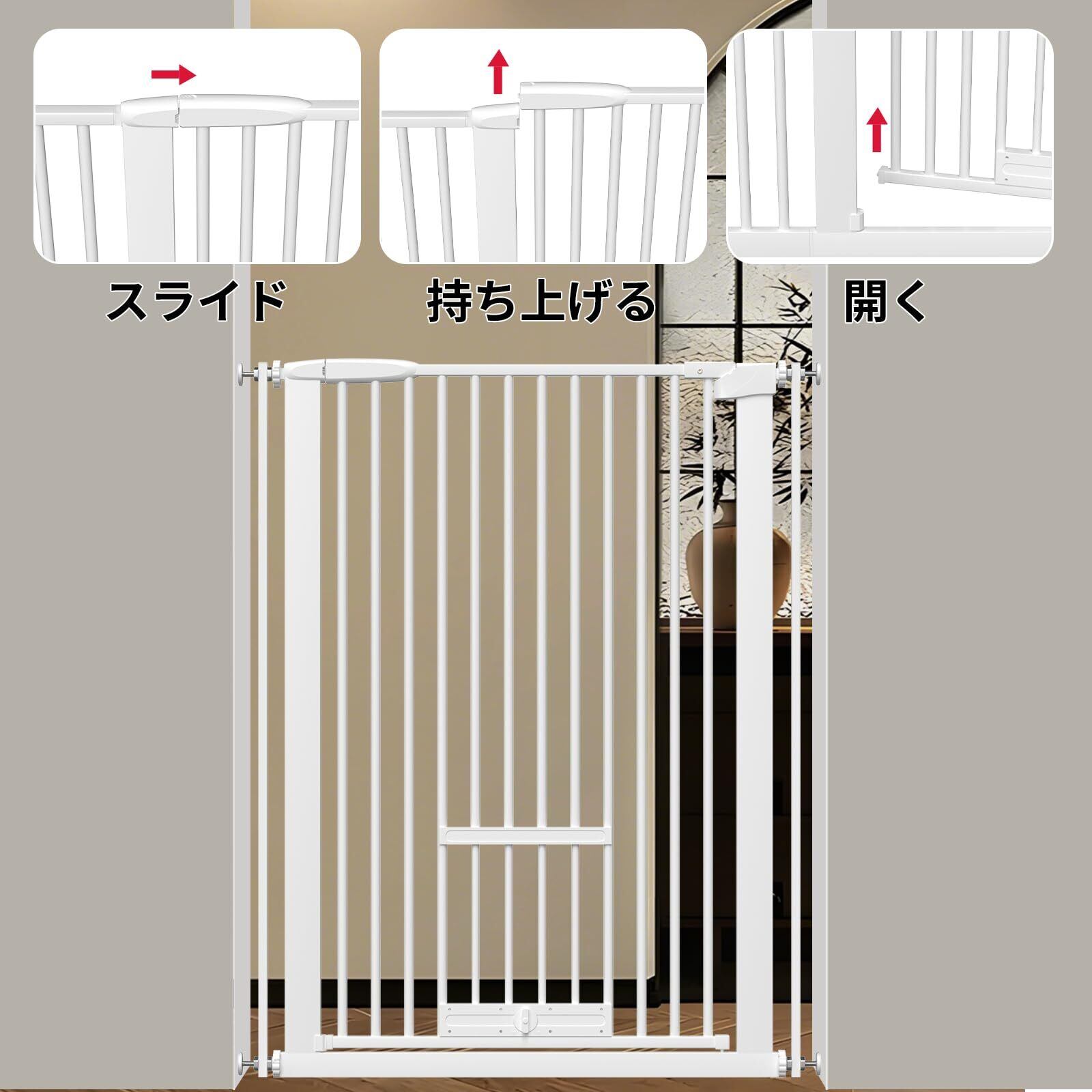 【ダブルロック】ペットゲートの上部にあるロックを引き上げて開ける仕組みで、小さなお子様やペットの飛び出しを防ぎます。片手でボタンをスライドさせて同時に引き上げでロックが解除できます。ゲートは大人にとってすごく簡単に開けるように作ったが、赤ちゃんやペットにとって難しいロックです。