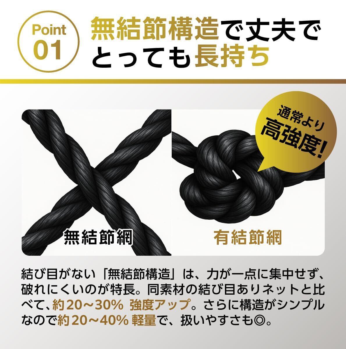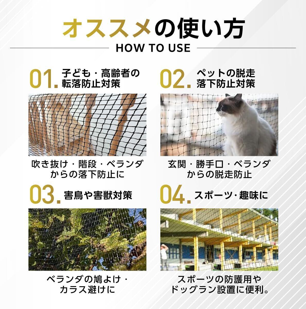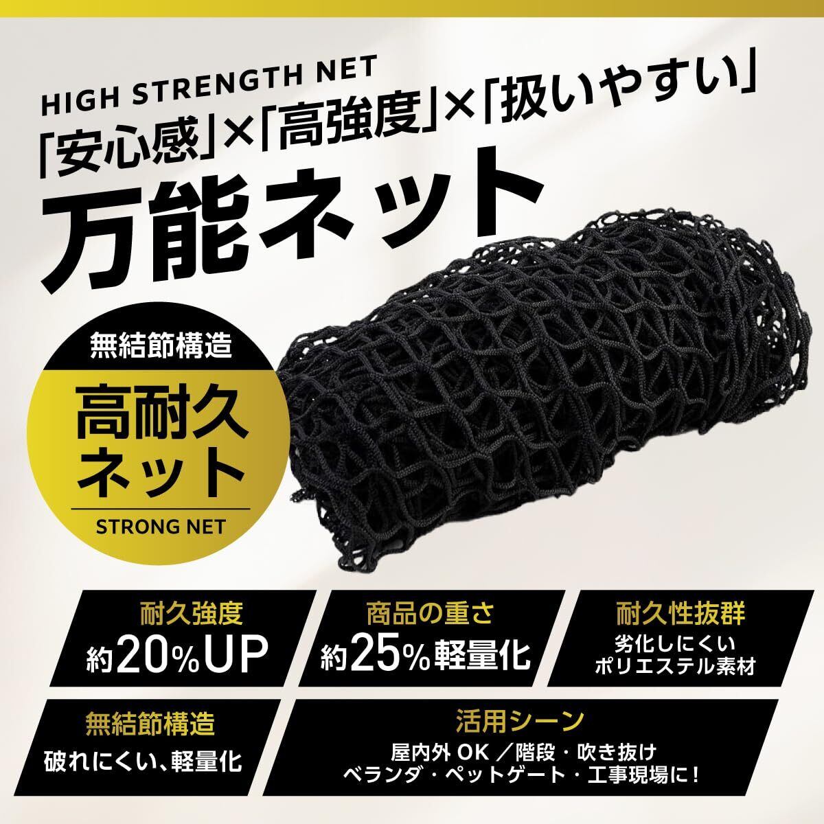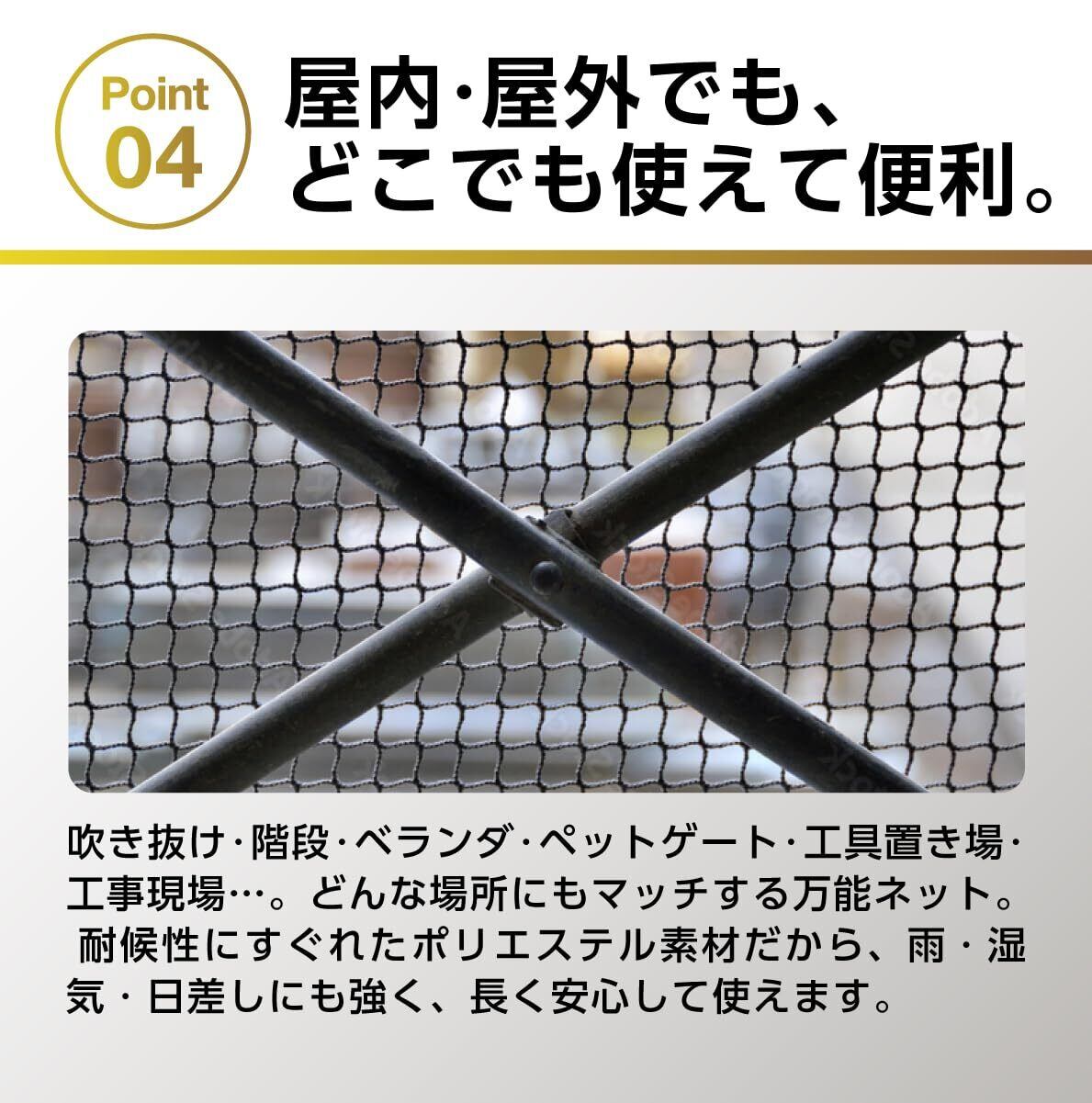 【多目的用途 ~ 様々な場所で活躍】高強度と弾性回復能力があるポリエステル素材で作られているので、 階段の吹き抜け空間に設置しお子様やペットの転落防止、お部屋の装飾用ロープネットとしての使用、キャンプやアウトドアなどでの使用、ベランダに飛来する鳩やカラスなどの侵入防止用、害獣や害鳥に畑を荒らされない用、危険な動物からご自身の身を守る用など、多目的用途が多く様々な場所で大活躍してくれます。