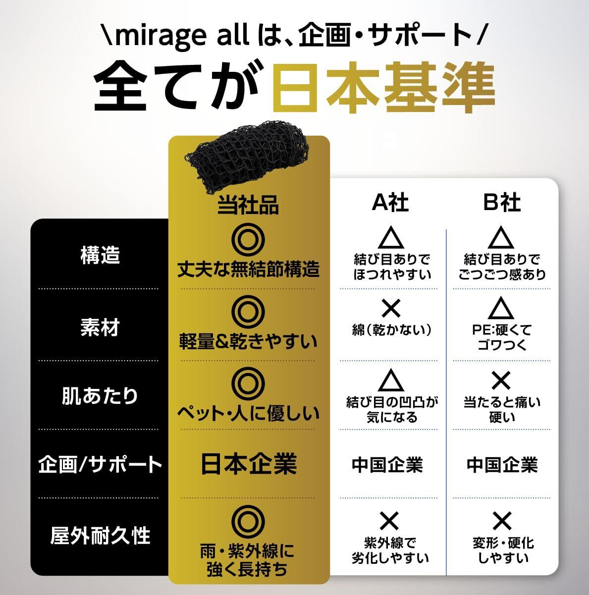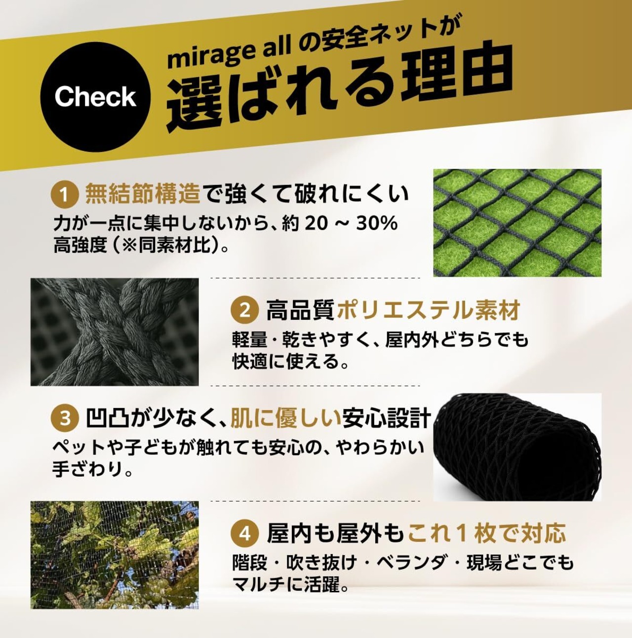 【ポリエステル ~ 様々な特徴】「mirage all」の安全ネットはポリエステル素材を採用しているので、「生地が強い」、「縮みや型崩れが起きにくい」、「熱に強い」、「虫に食べられない」といったあらゆる面で耐久性に優れています。ポリエステルは吸収性が低いため、洗濯後もすぐに乾いてくれる速乾性も優れています。また、耐候性にも優れており、長期間外気に触れていても劣化しないため、アウトドア用品にも幅広く使用されています。