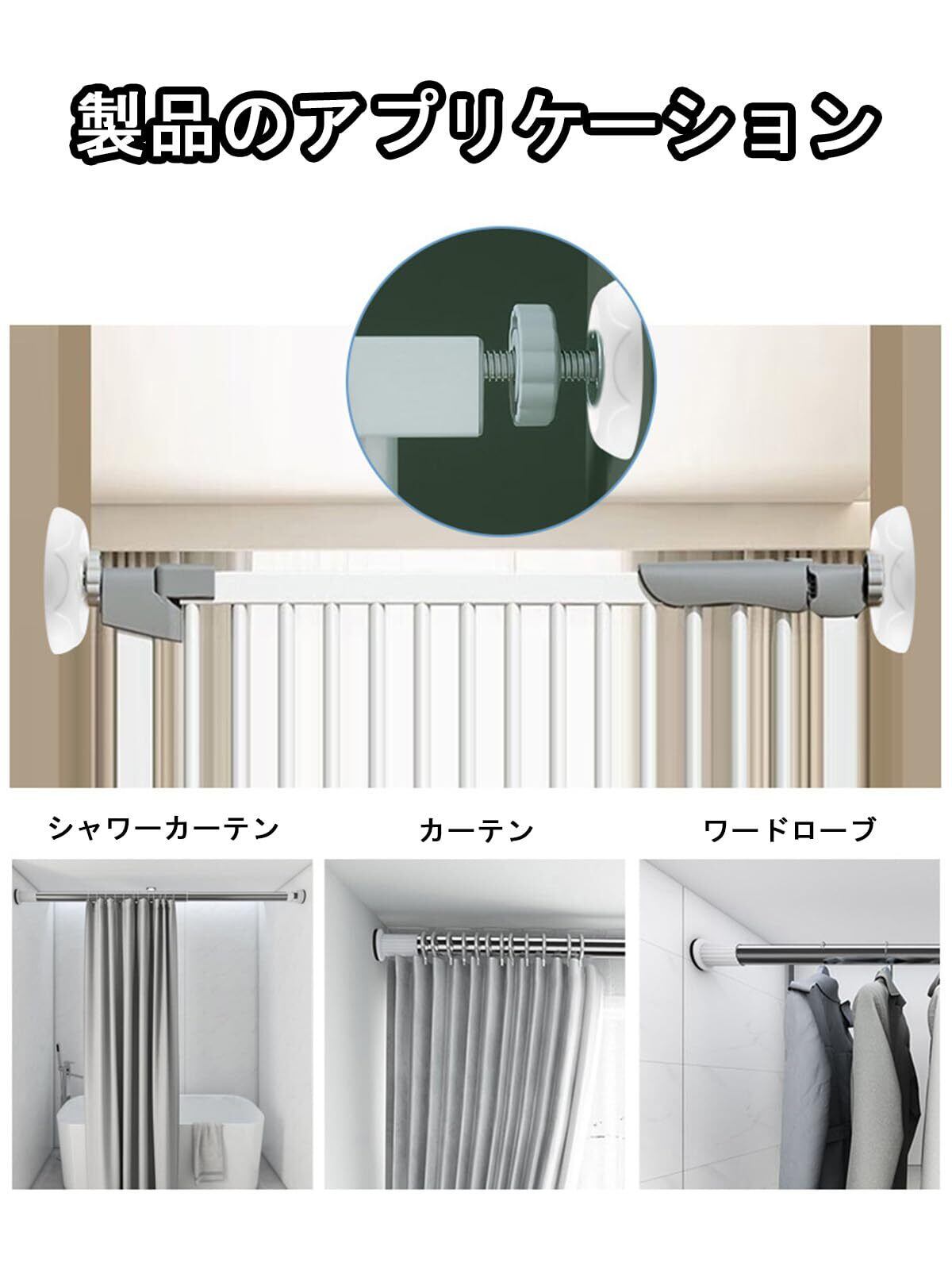 【主な用途】安全ドアガードレール、ドア手すり、シャワーカーテンロッド、カーテンロッド、ワードローブロッドなどに設置できます。