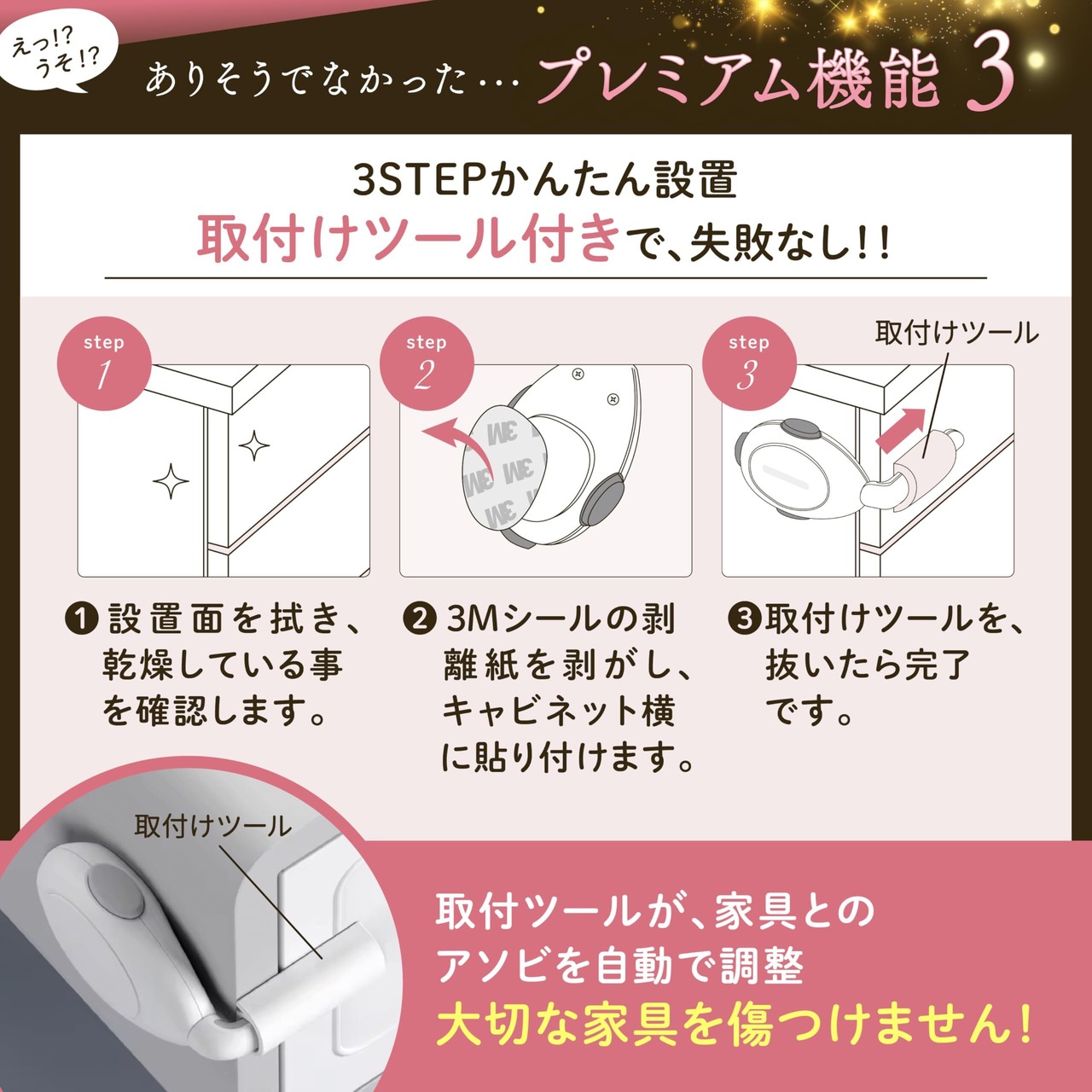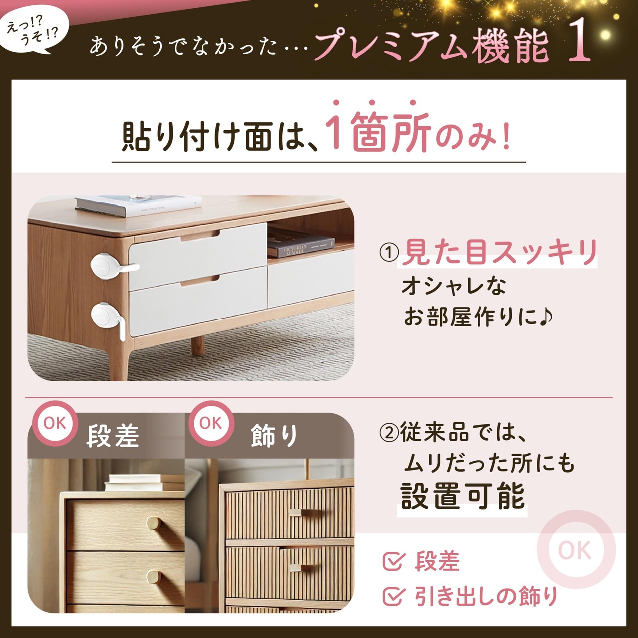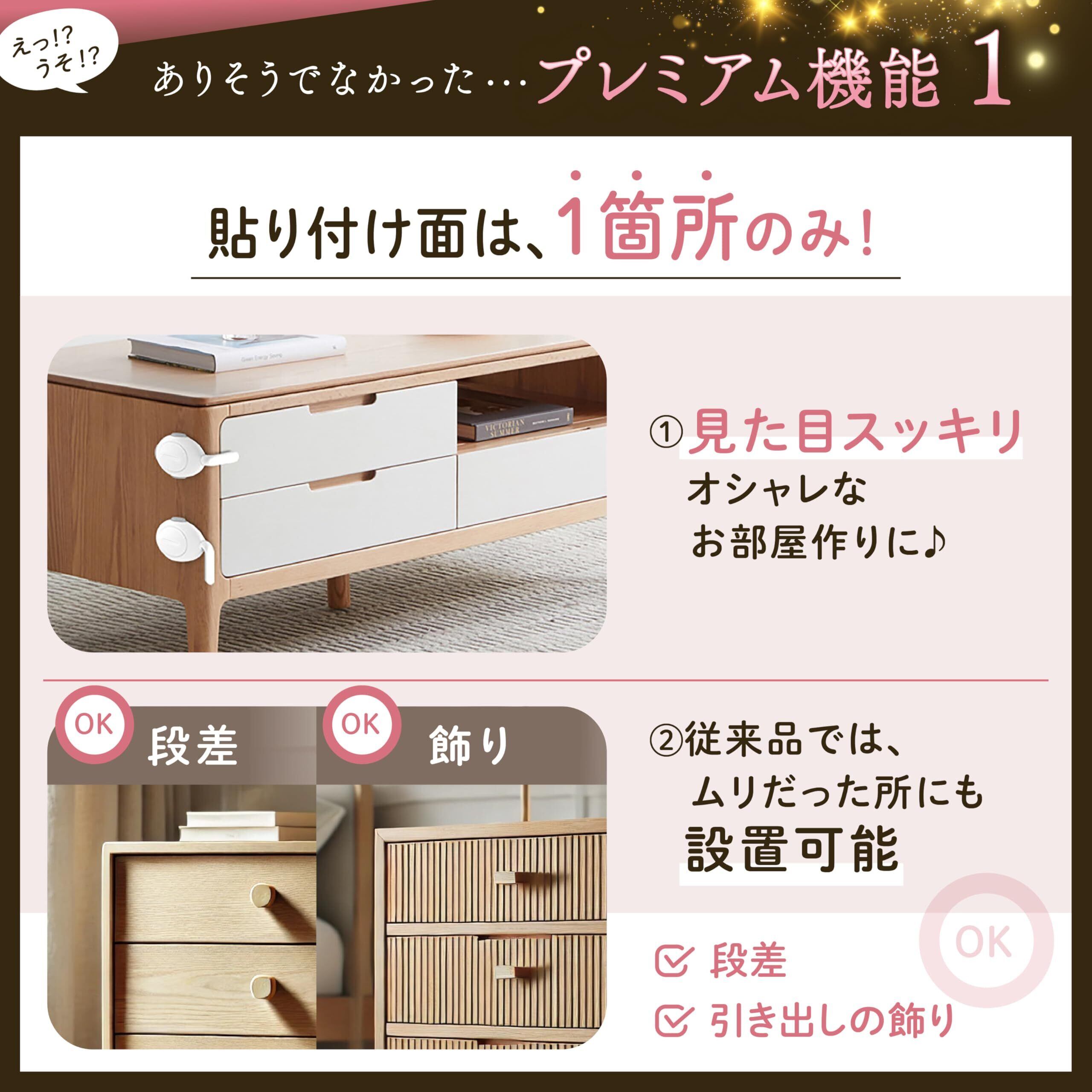 【貼り付け面は 1箇所のみ】①アンロック時、ベルトロックのような引出し 前面にロック が無く、シンプルで美しい。 ②これまで設置できなかった引出し前面にに飾りがある家具、段差がある引出しにも設置可能