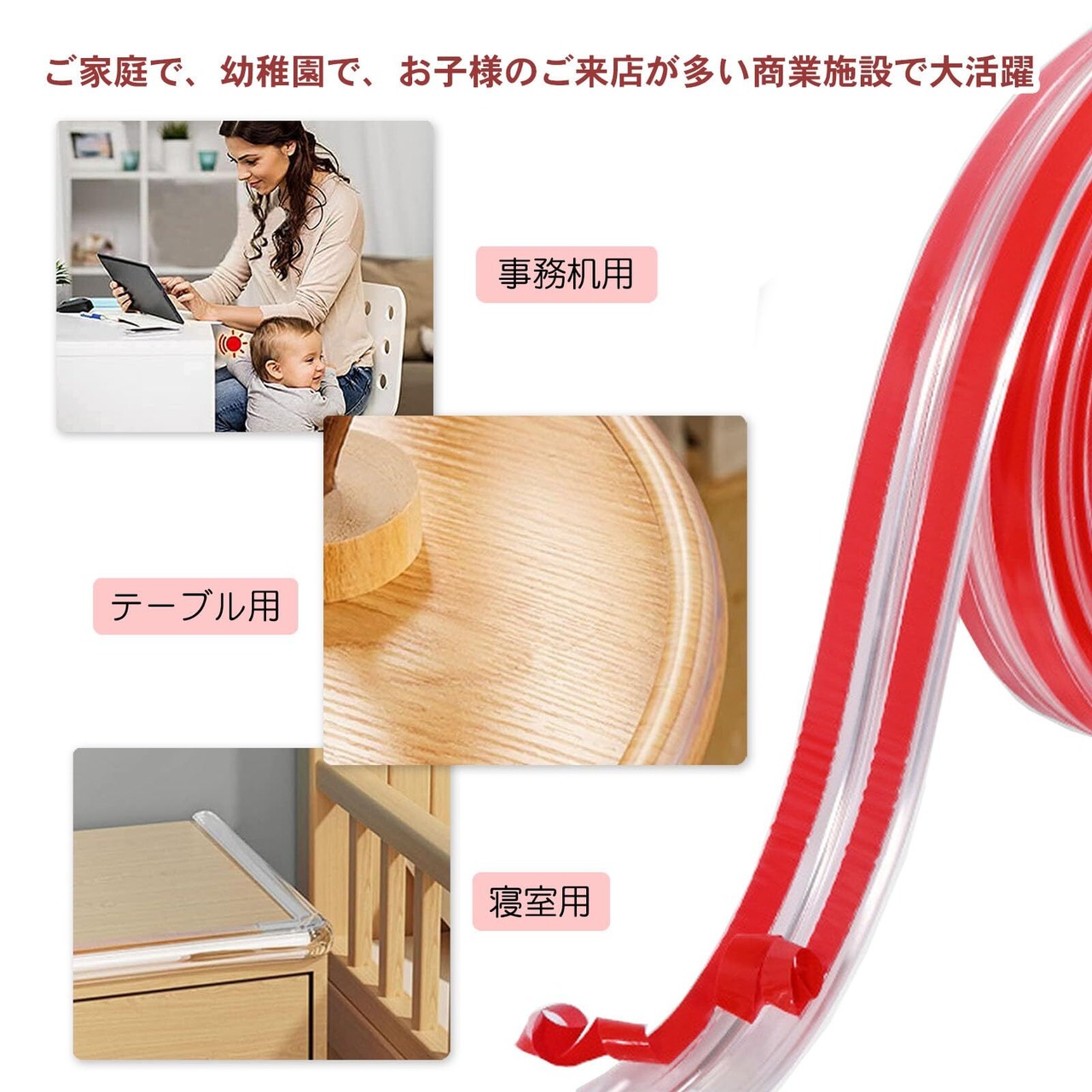 【様々な家具にも】 固体、木材、ガラス(プラスチック、鋼、セラミック)などのさまざまな表面に適しています。テーブルやベッドなどの家具やキッチン、オフィス、ベッド、テレビボード、本棚、キャビネット、ガレージなどの家具の角等様々な場所で実際にお使い頂いております。赤ちゃんや子ども、高齢者がテーブルの角にぶつかってけがをするのを防ぎます。ご家庭で、幼稚園で、お子様のご来店が多い商業施設で大活躍します。