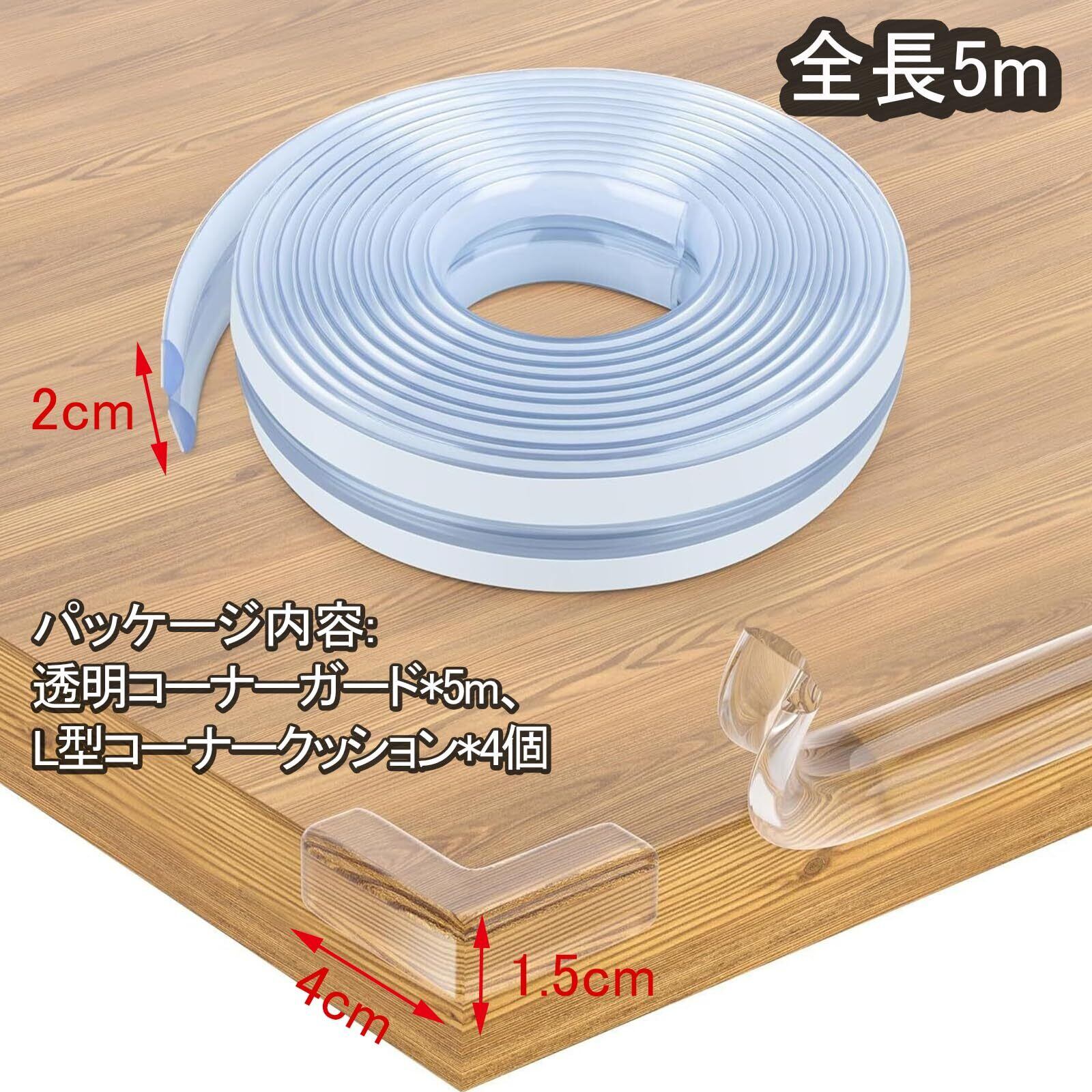 Celugud コーナーガード 透明 全長5m+4個L型 エッジ 保護クッション 両面テープ シール固定 PVC素材 クリア 強力テープ 操作簡単 着脱可能 赤ちゃん ケガ防止 安全対策 地震対策 テーブル かど 保護 家具 机の角 保育園 (5m +4個L型)