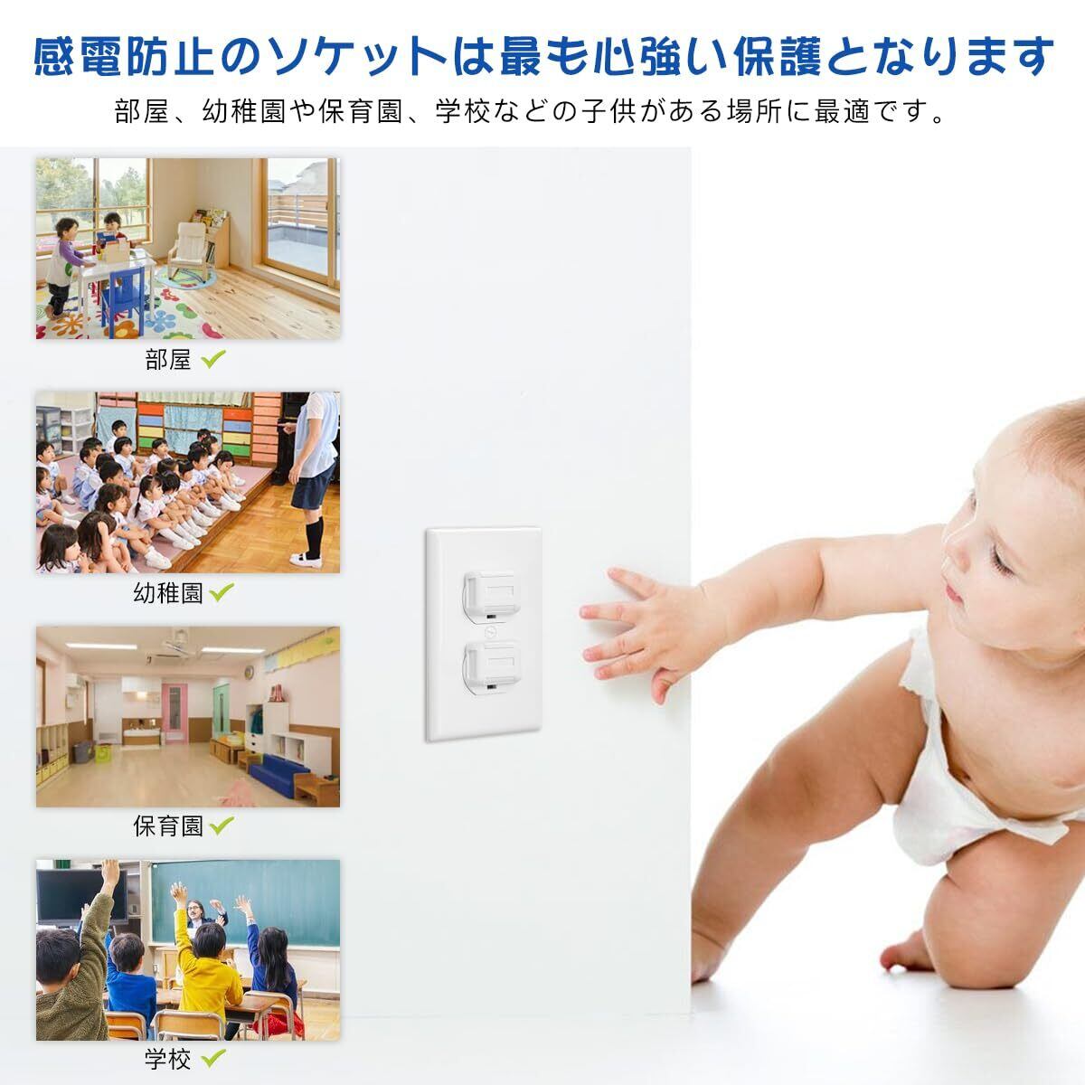 【感電防止】 :赤ちゃんの好奇心を危険なものにしないために、感電防止のソケットは最も心強い保護となります。部屋、幼稚園や保育園、学校などの子供がある場所に最適です。