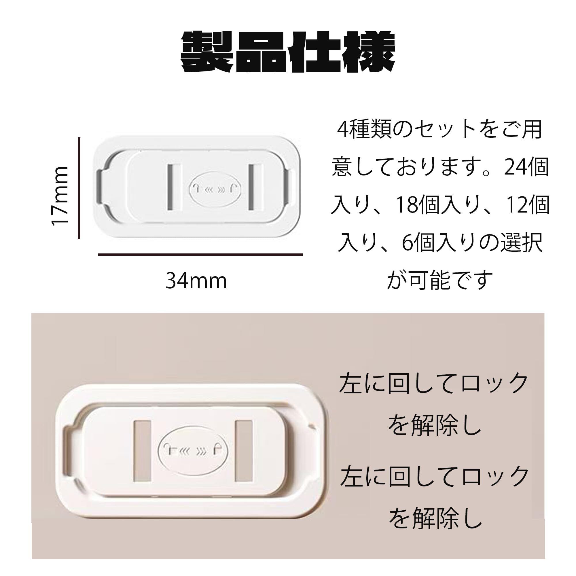 【製品仕様】本 コンセントキャップ は4種類のセットをご用意しております。24個入り、18個入り、12個入り、6個入りの選択が可能です。サイズは34*17ミリメートルです。コンセントに差し込むだけで使用でき、操作が簡単で安全です