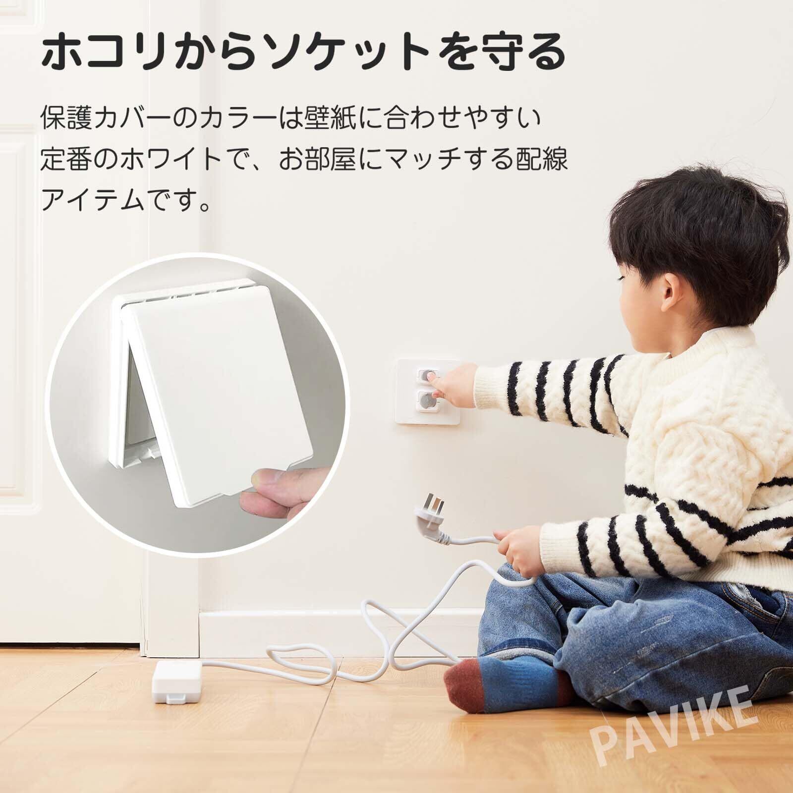 フタ付きのカバータイプなので、ホコリがたまって火災になるのを防ぎます。カバーの色は壁紙にマッチする定番のホワイトで、お部屋に馴染む配線アイテムです。