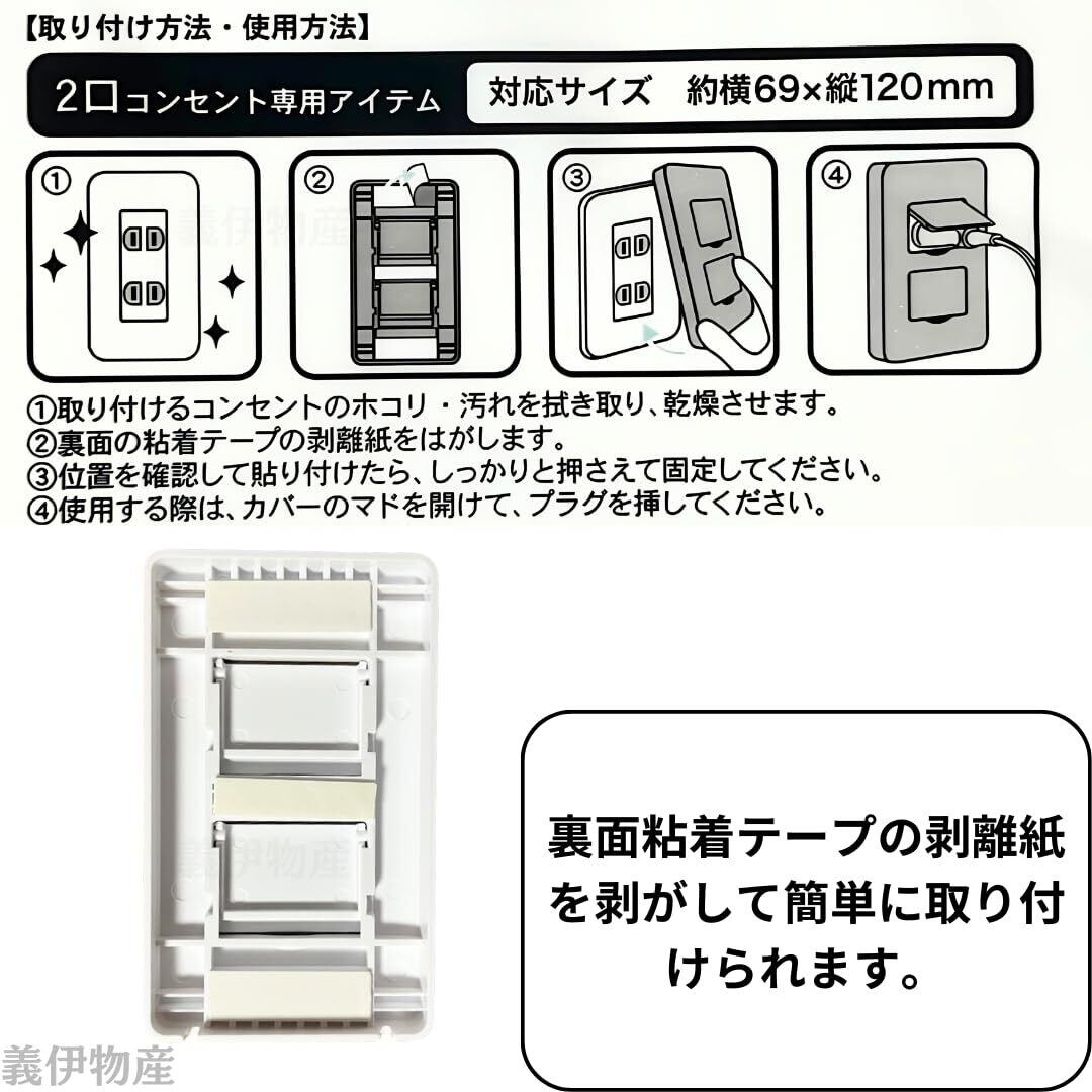 2口コンセント専用のコンセントカバーでお子様が開けにくい窓が付いています。 シンプルなデザインのコンセントカバーはインテリアに馴染んでくれます。裏面粘着テープの剥離紙を剥がして簡単に取り付けられます。