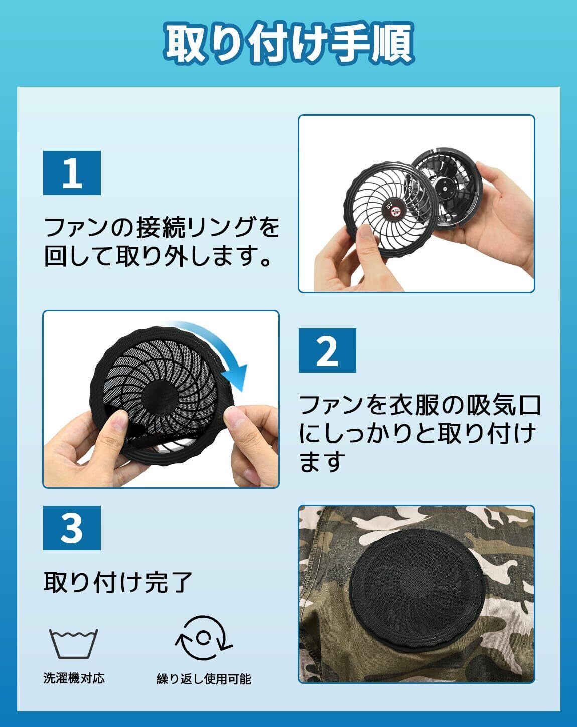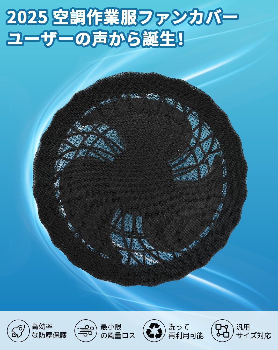 【優れた耐久性・長期間使える高品質素材】本 空調服 ファンカバーは、伸縮性と耐久性に優れた100%ポリエステル素材を採用。不織布に比べて破れにくく、繰り返し使用しても形状を保ちやすいため、長期間にわたって安定した保護性能を発揮します。軽い汚れであれば簡単に洗い落とすことができ、過酷な作業環境でも安心してご使用いただけます。頻繁な交換が不要なため、コスト面でもメリットがあります。 ※火気の近くでは使用しないでください。