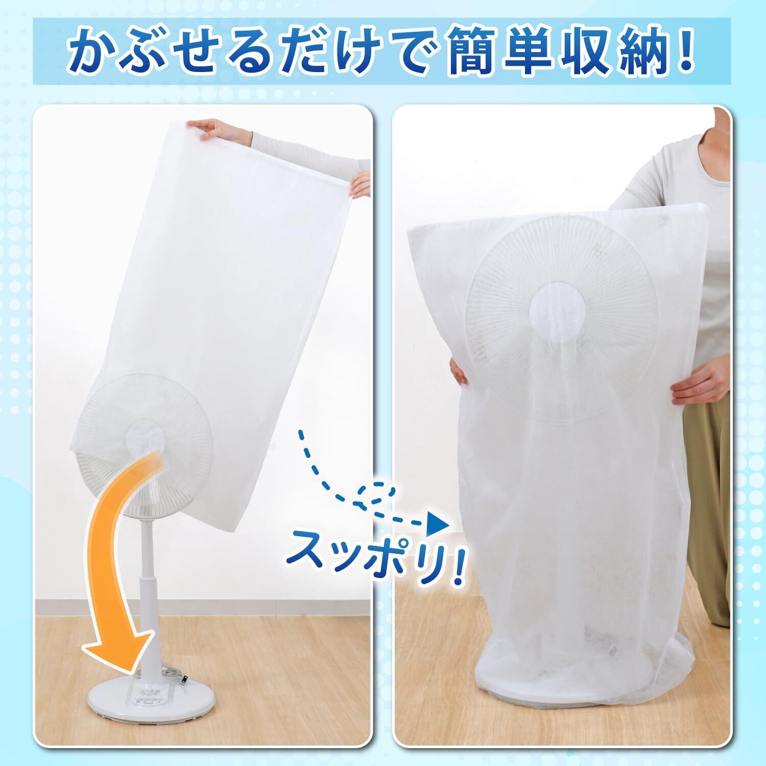 【かぶせるだけ】:オフシーズンの扇風機に上からすっぽりとかぶせるだけで簡単カバー。