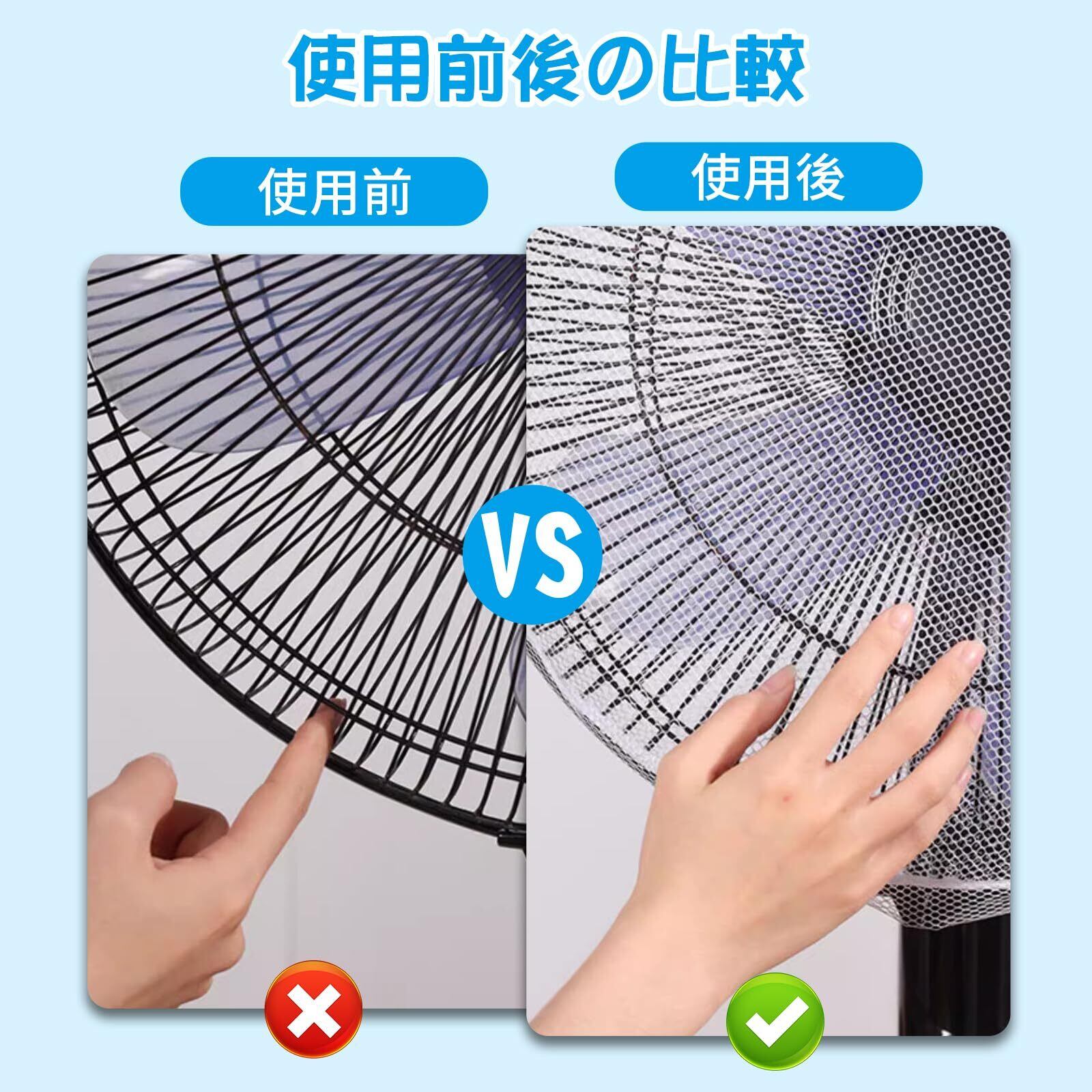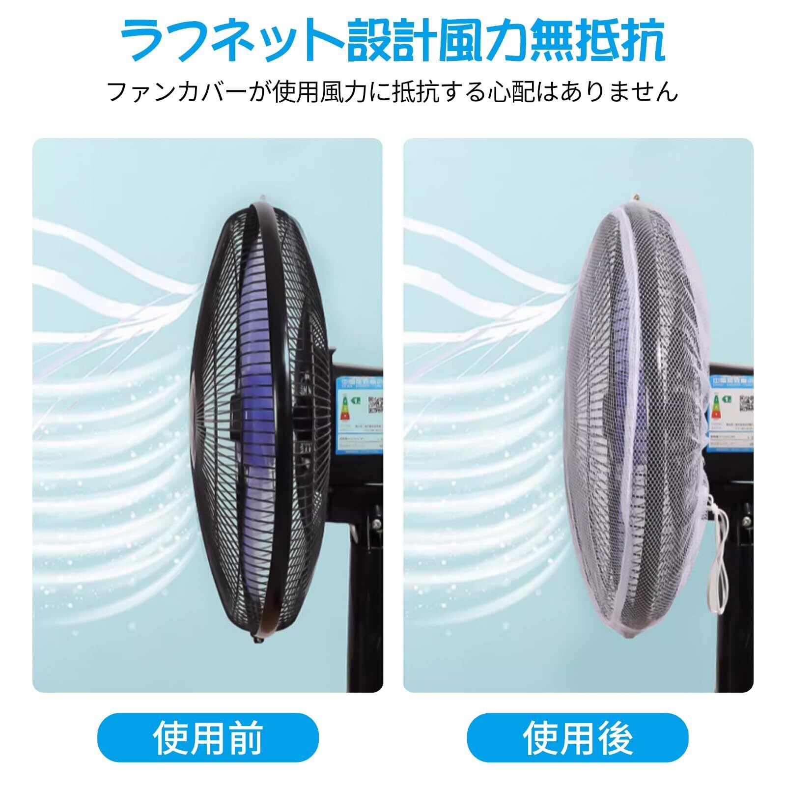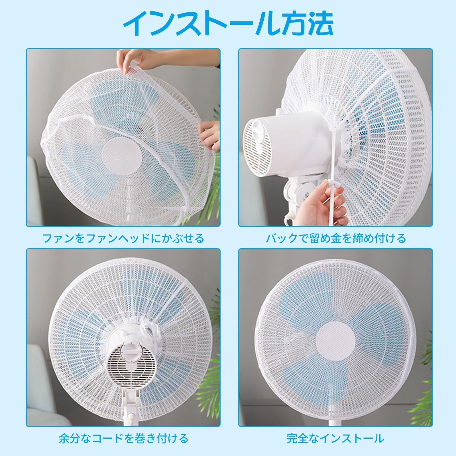 【扇風機カバー】裏までかかる為、 小さなお子様やペットのいたずら防止に安心。裏までかかる、子供が後ろから手を入れる心配がなく安心。細かいメッシュでファンの風、柔らかい自然風を効果的に制御します。