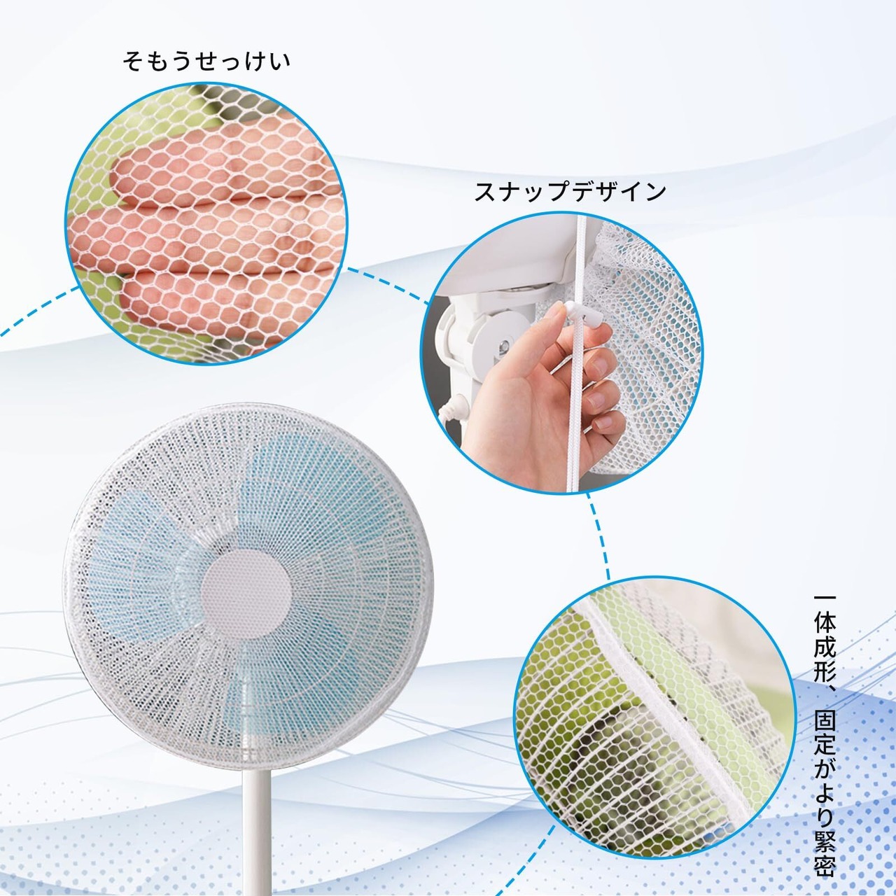 【高品質】生地はメッシュ状になっているので、細かいメッシュが扇風機の風を適宜に抑え、やわらかく自然な風あたりになります、健康にも良いです。固定力が高く、簡単に外せない紐タイプのセーフティーネット。