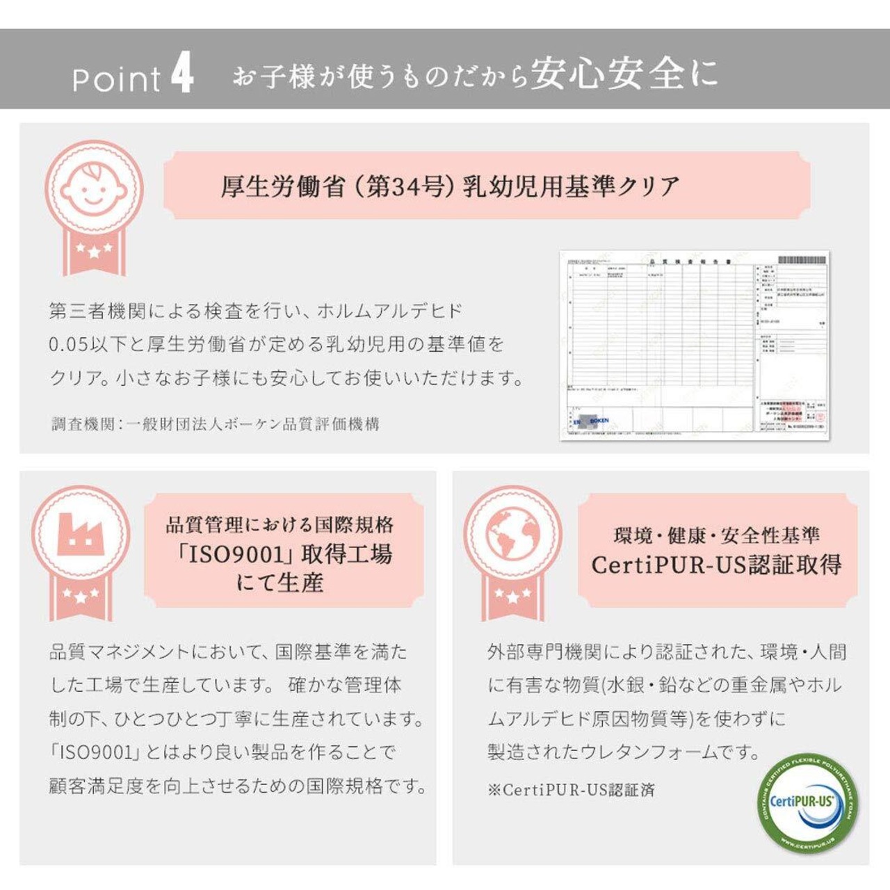 Point.4 使いやすさにもしっかりこだわる 子どもたちの暮らしを守る基本機能に使い勝手もプラス。 パパママの使いやすさにもこだわってお作りしました。 ・集合住宅におすすめの防音性 ・しっかりとした耐久性 ・お手入れ簡単防水性 ・折りたたんで、片付く ・冬も寒くない保温性 ・カバーは外して洗濯OK Point.5 厚生労働省(第34号)乳幼児用基準クリア 第三者機関による検査を行い、ホルムアルデヒド0.05以下と、厚生労働省が定める乳幼児用の基準値をクリア。 小さなお子様にも安心してお使いいただけます。