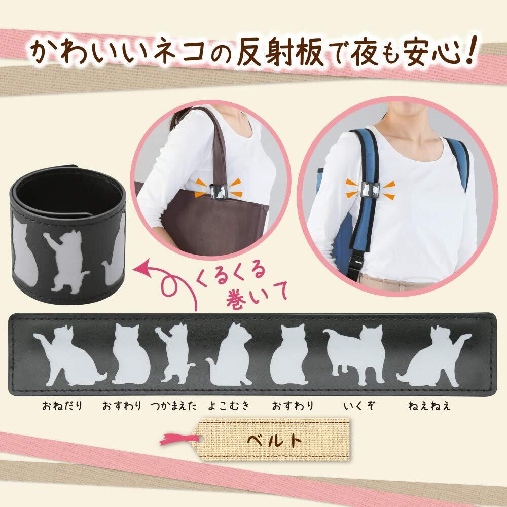 かわいいネコの反射板で夜も安心!光が当たるとネコの形が反射するベルトです。■大人が持っても高級感がでるよう革風の素材でバッグやリュックに付けられます。 ベルトはリュックに付けておいて、ランニングなどをするときに手首に付け替えたりできる便利なスラップ式です。