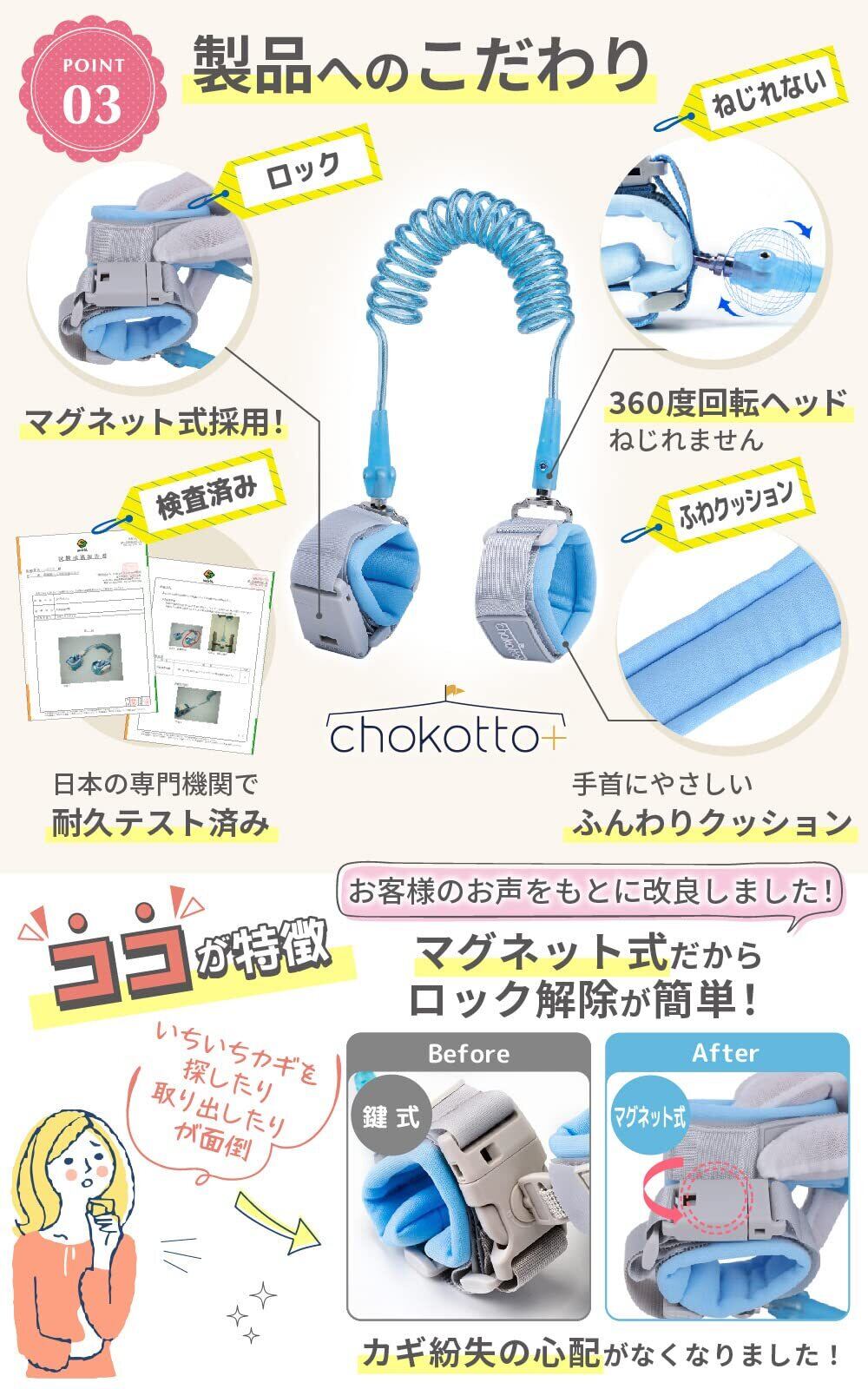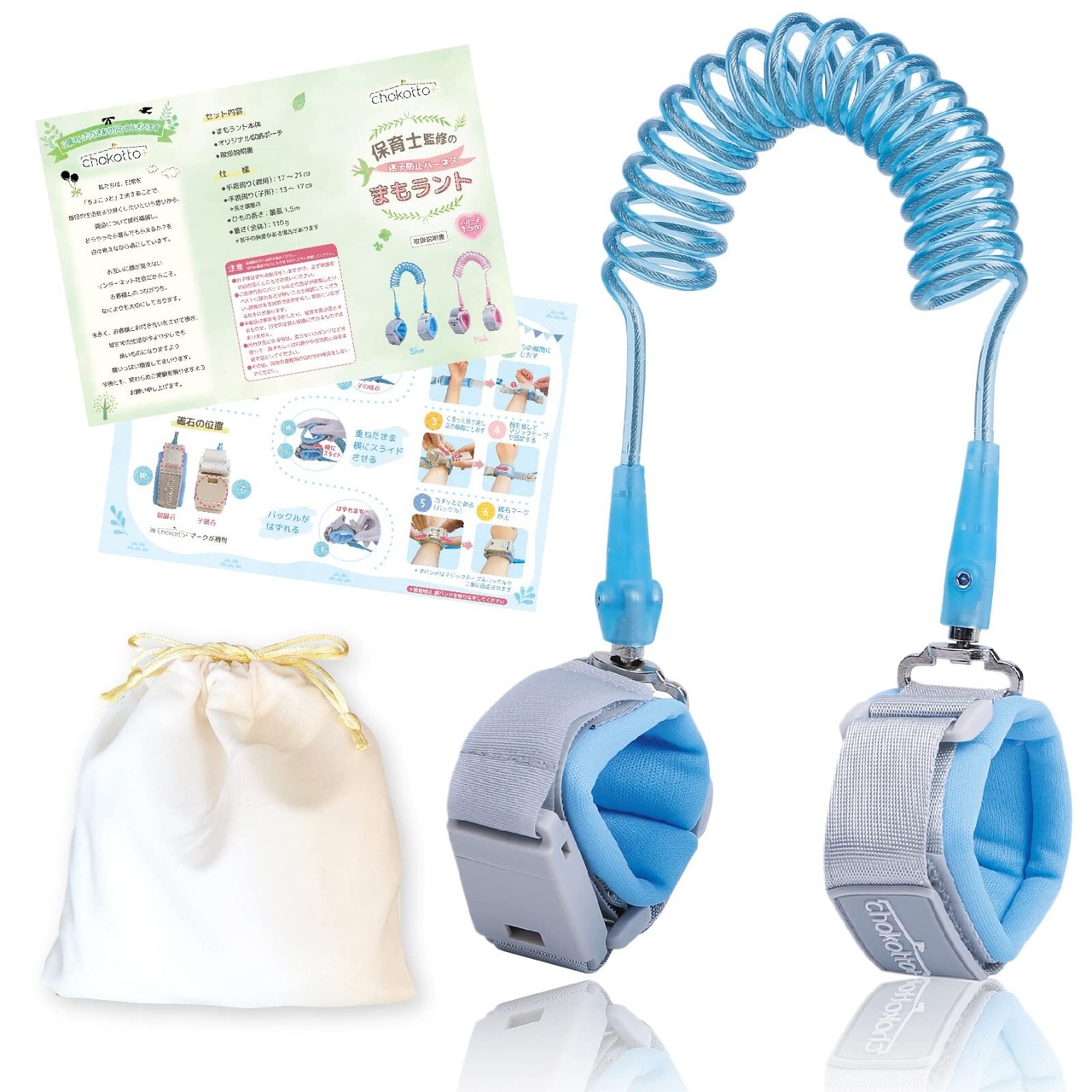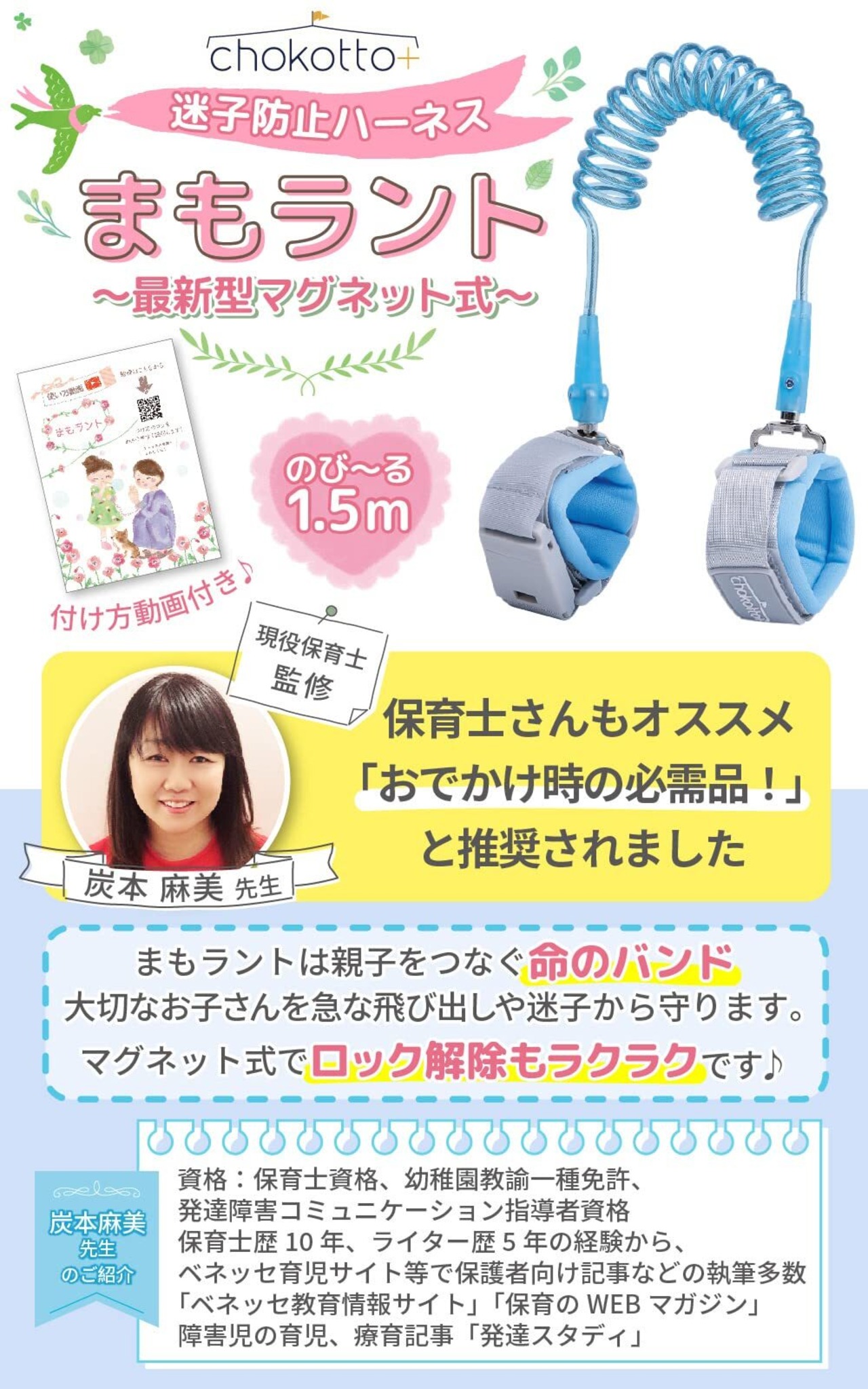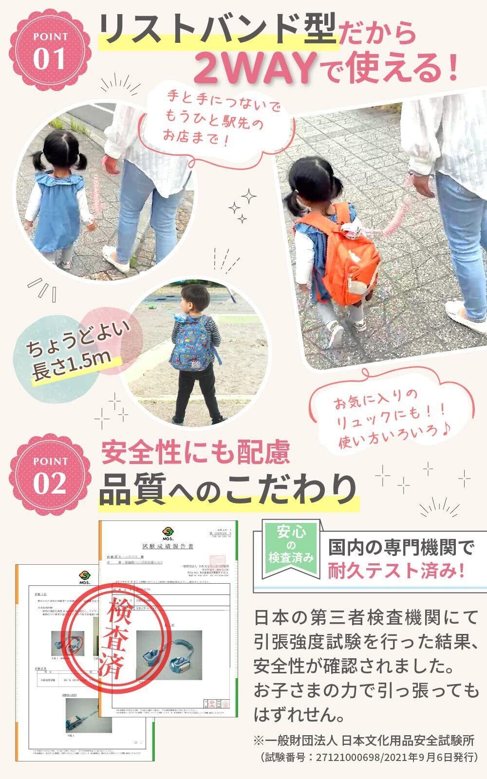【現役保育士が監修!】当店の『まもラント』は、保育のプロ、現役保育士が監修した製品です。おすすめポイント①最新型マグネット式を採用、取りはずしが簡単に!鍵紛失の心配はもういりません。②回転ヘッドをより広く、360度回転するから、ひもねじれのストレスがありません。③さらに肌にやさしいふわクッションを採用、手首がラクに④伸び~る1.5m、すぐに手をつなげる、ほど良い長さです。➄親・子バンド合わせて110g、卵2コ分の軽さです。 お子さんの迷子防止、飛び出し防止、安全対策に!まもラントはママの味方です。