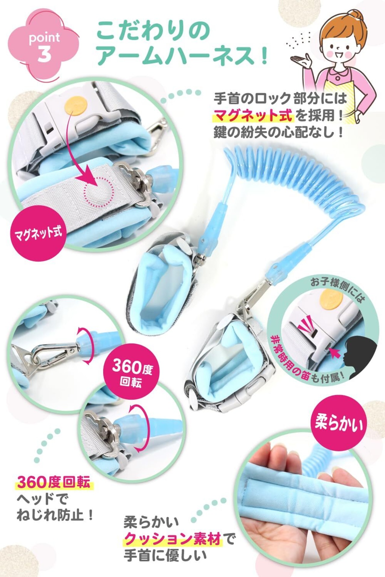 【こだわりのアームハーネス!】アームハーネスのロック部分はマグネット式&非常時用の笛付き!鍵を無くすリスクを減らし非常時も周りに知らせることができます!
