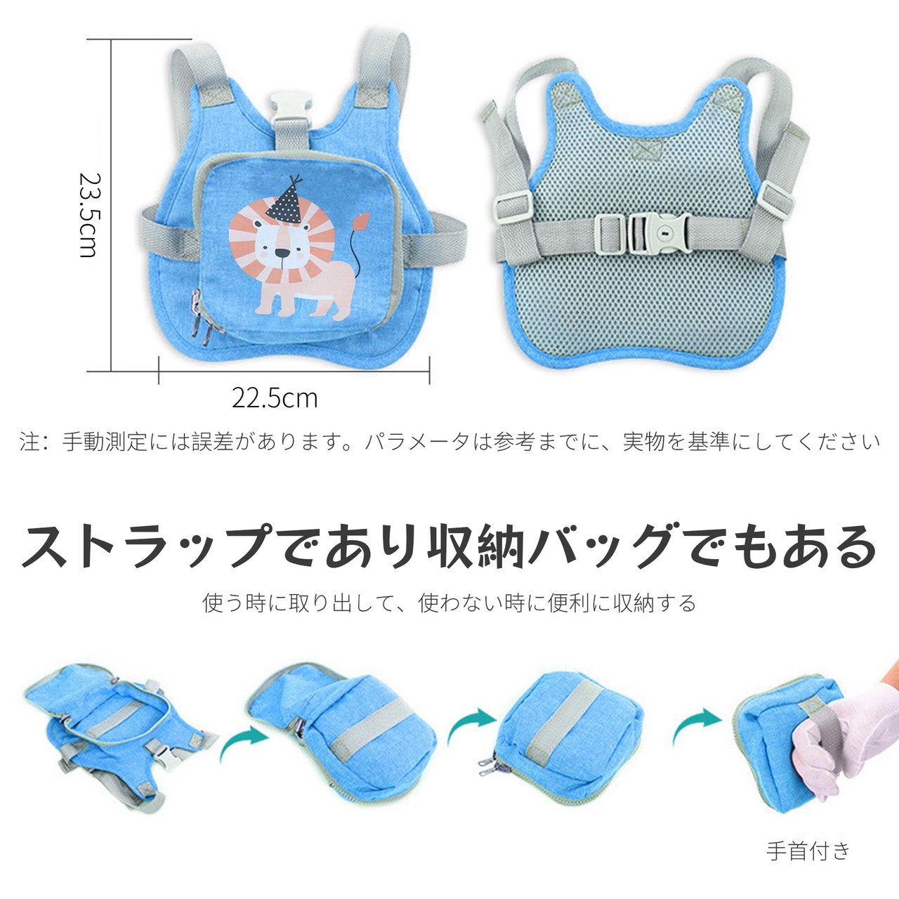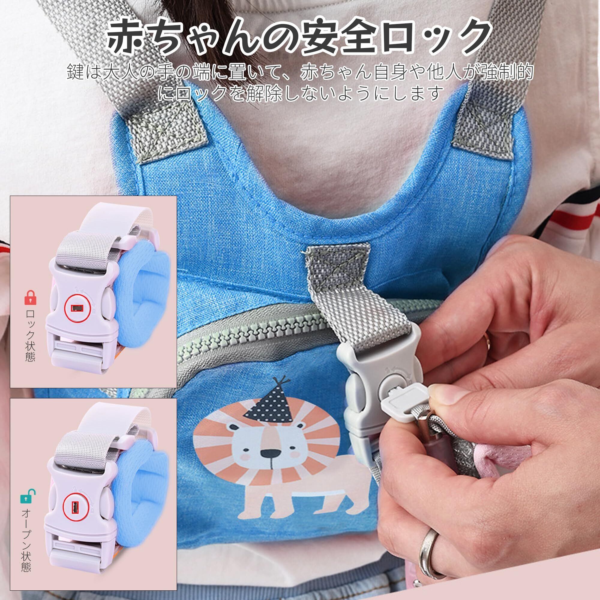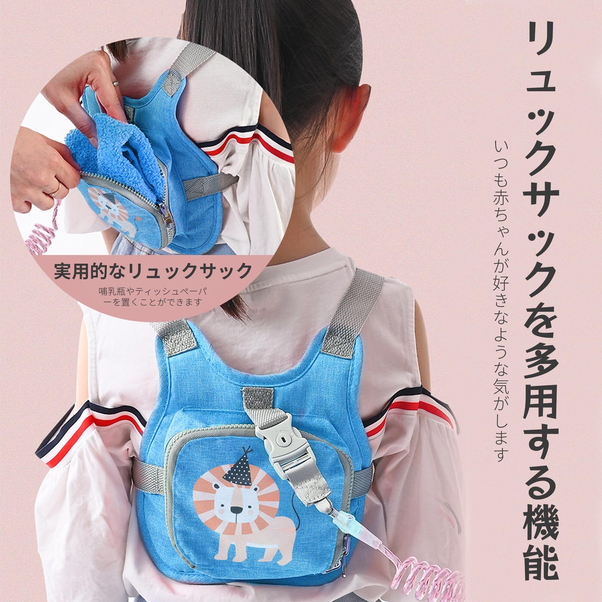 【製品の内容】:迷子防止リュック -青いライオン/反射ひもタイプ - 1個【サイズ】:23.5*22.5cm、150cmの反射バネ付きロープを持っています 【適用月齢】:1歳以上