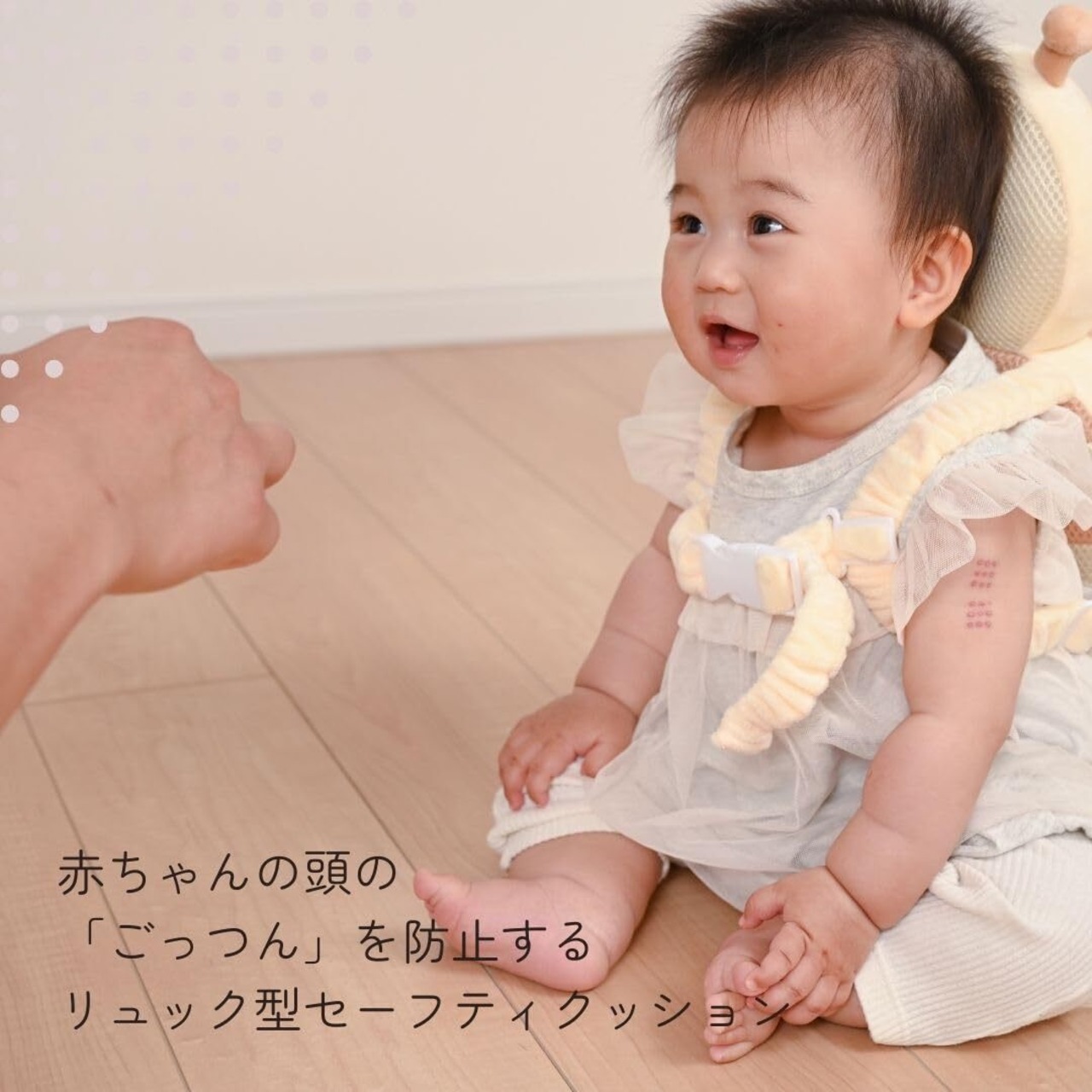 【頭部をしっかりガード】 伝い歩き・ハイハイ・おすわり中の赤ちゃんの転倒時に、頭をやさしく守るリュック型セーフティクッション。柔らかクッションが衝撃を吸収し、「ごっつん」を防ぎます。