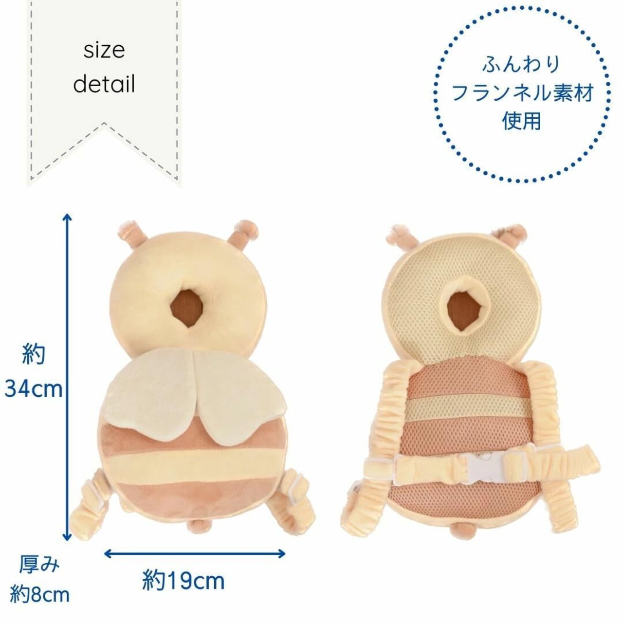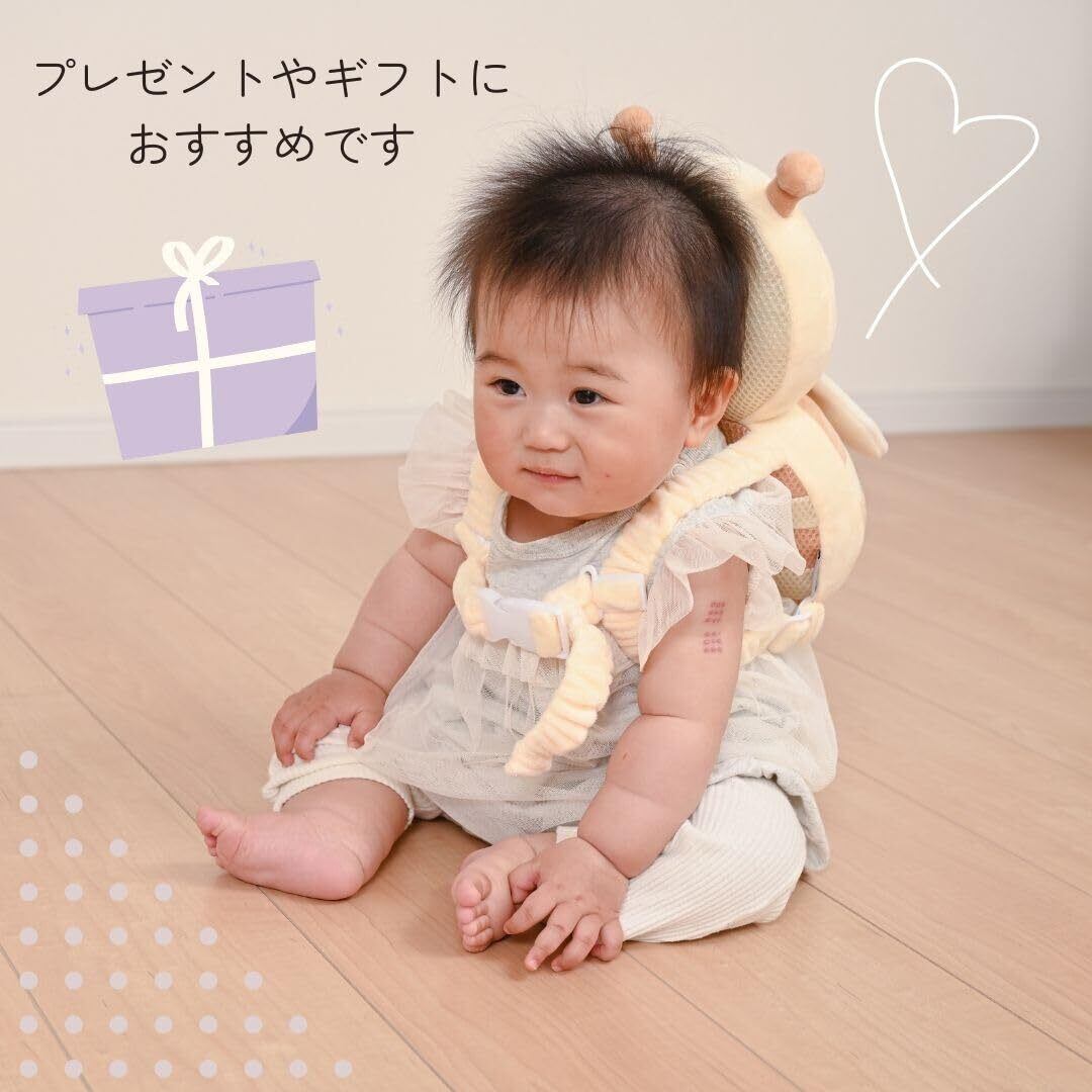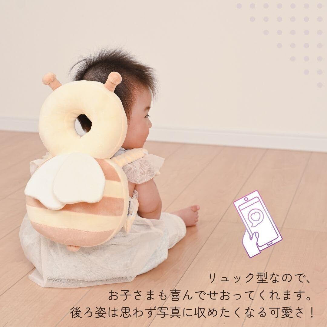 赤ちゃんの転倒からやさしく守る! リュック型のセーフティクッションは、ハイハイ・おすわり・伝い歩き期の赤ちゃんにぴったり。見た目の可愛さと実用性を兼ね備えた、プレゼントにも最適なアイテムです。 製品特長 【頭部をしっかりガード】 転倒時の衝撃から赤ちゃんの頭を保護するクッション設計。柔らか素材で、万が一の「ごっつん」もやさしく吸収します。 【ふんわりフランネル素材&通気構造】 肌ざわりの良いフランネルを採用し、内部は通気性の高いメッシュ構造。厚さ約8cmのふっくらクッションで、長時間装着しても快適です。 【安心のセーフティベルト付き】 赤ちゃんの動きにフィットするセーフティベルトを標準装備。ズレにくく、アクティブな動きにも安心です。 【可愛いデザインでギフトにも◎】 ハチさんのような愛らしいデザインで後ろ姿もキュート!サイズ約34×19cmで、出産祝いや誕生日プレゼントにも喜ばれます。 おすすめ用途 ・おすわり・ハイハイ・つたい歩き期の安全対策 ・出産祝い・お誕生日プレゼントに ・写真映えするベビーアイテムをお探しの方に
