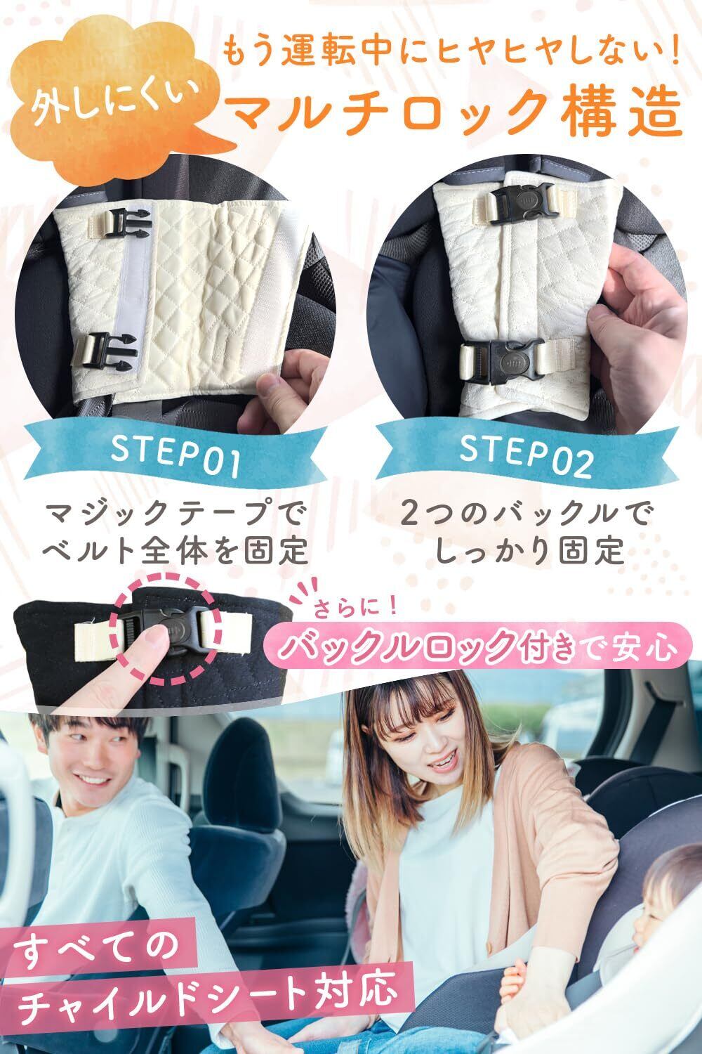【 マルチロック構造採用/大きめ扇形デザイン 】 チャイルドシートベルトには、" マジックテープ "と" 2つのバックル "でしっかりと固定。さらに、 バックルロック 付きなので、お子様自身で外しにくい構造になっています。本体は、カバー全体でベルト部分を大きく覆うので、肩抜けしにくい構造に。また、使用しないときも片方のベルトに取り付けたままにできるのもポイントです。