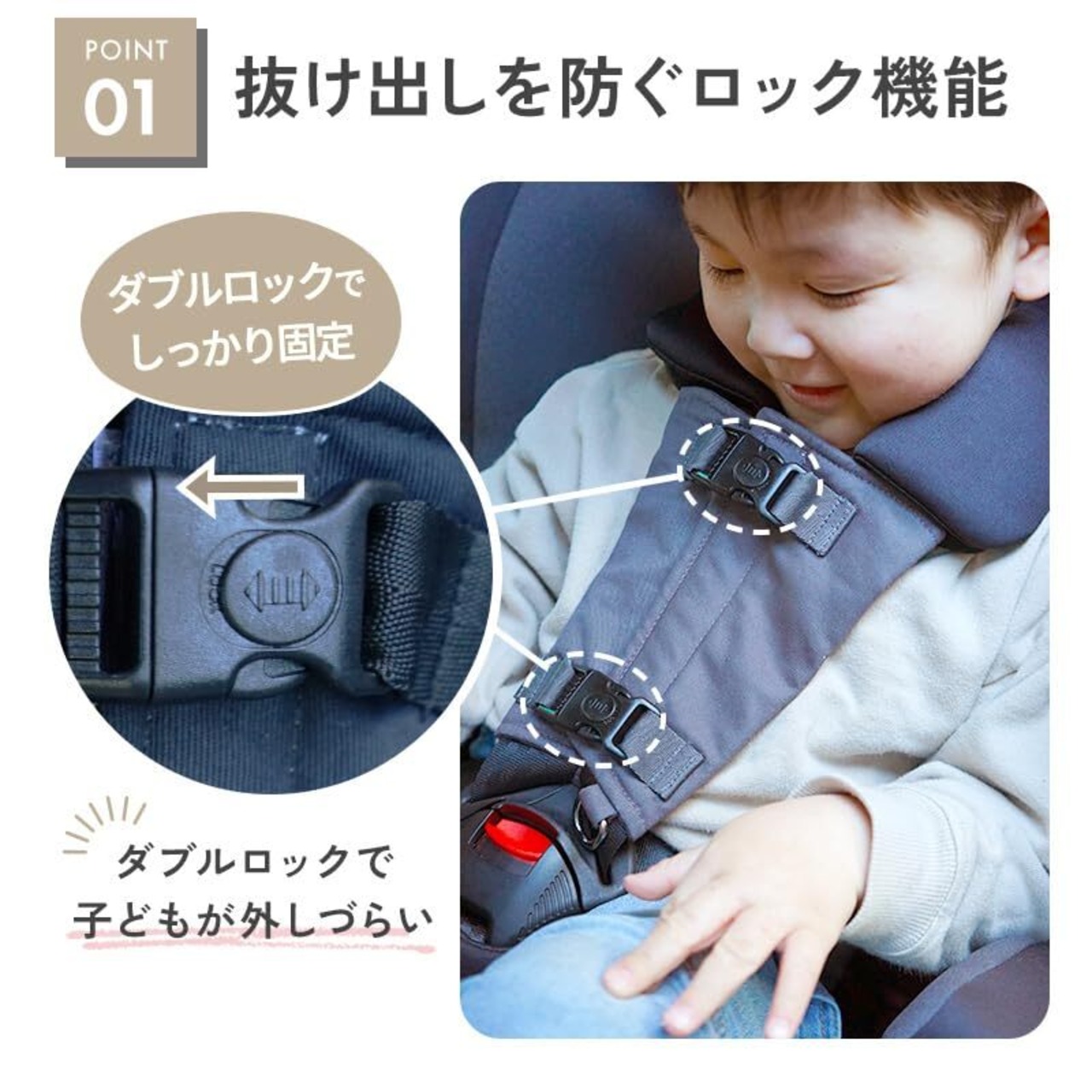 【抜け出しを防ぐロック機能】左右一体型のWロックでお子様が外しずらい設計