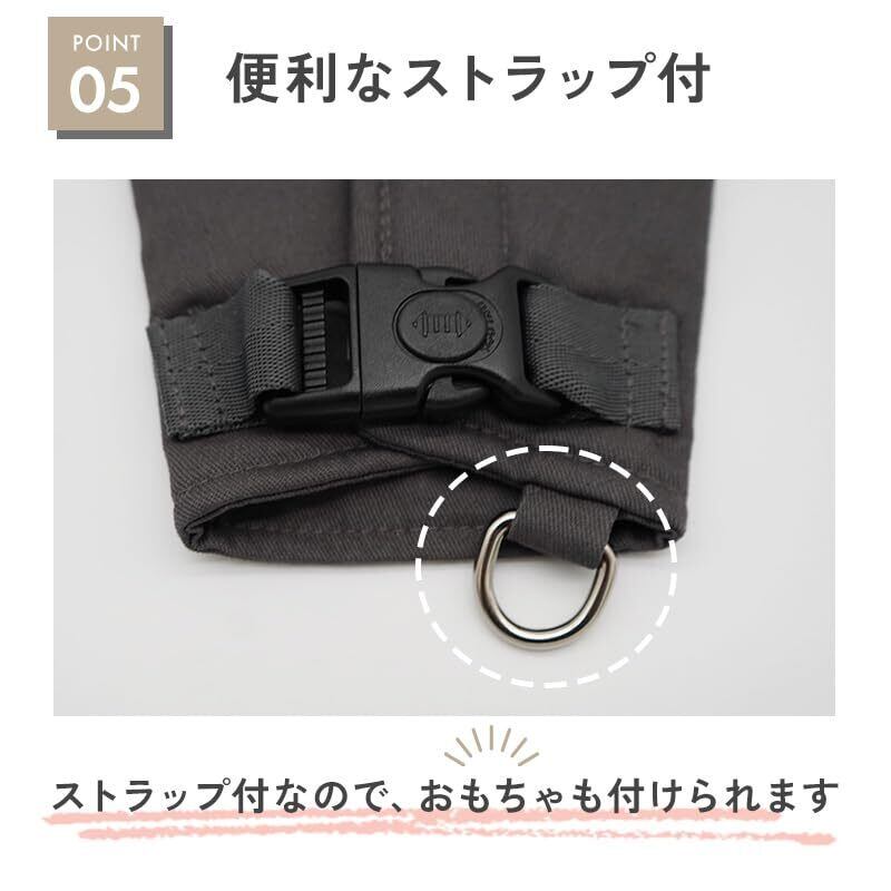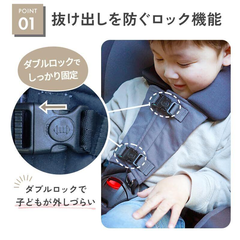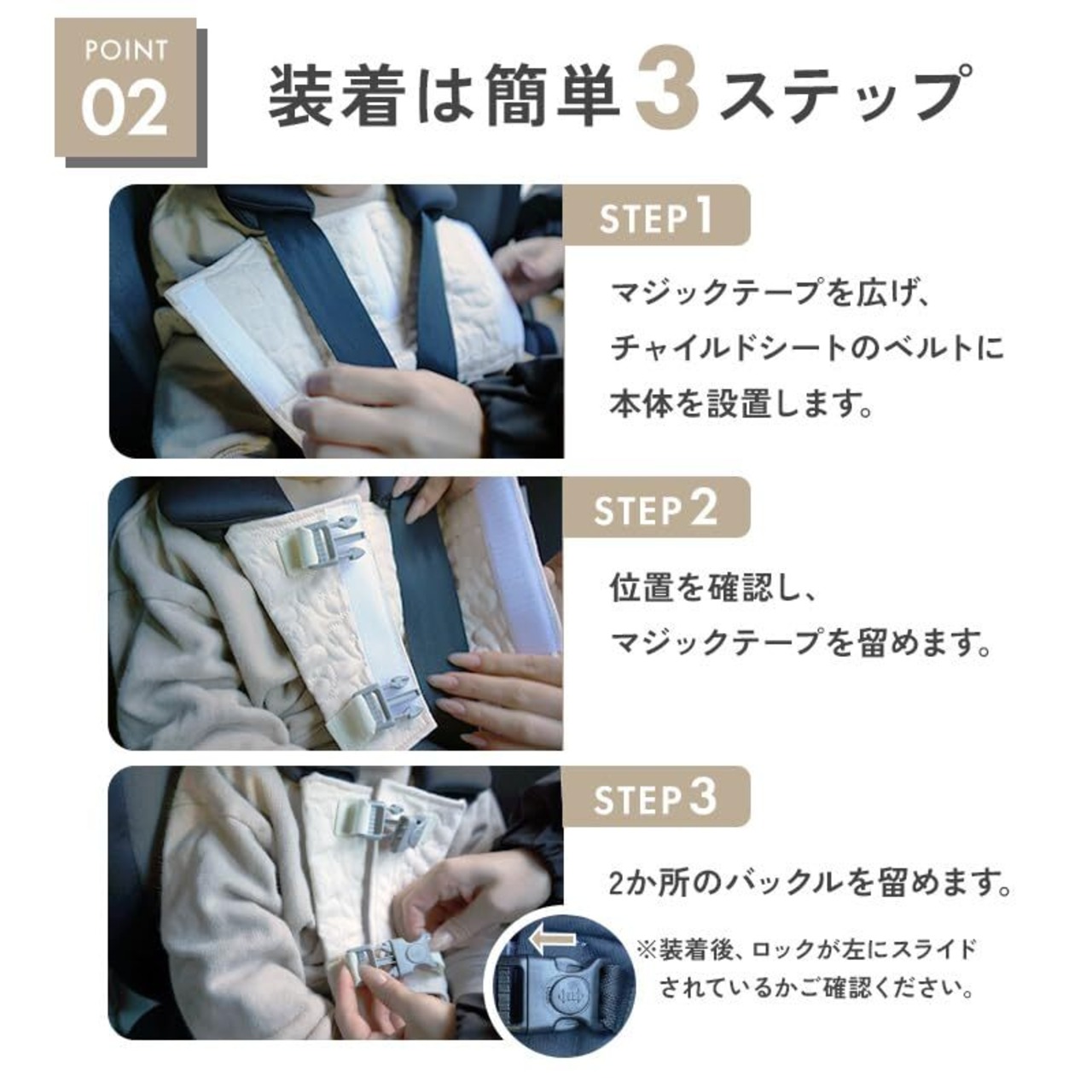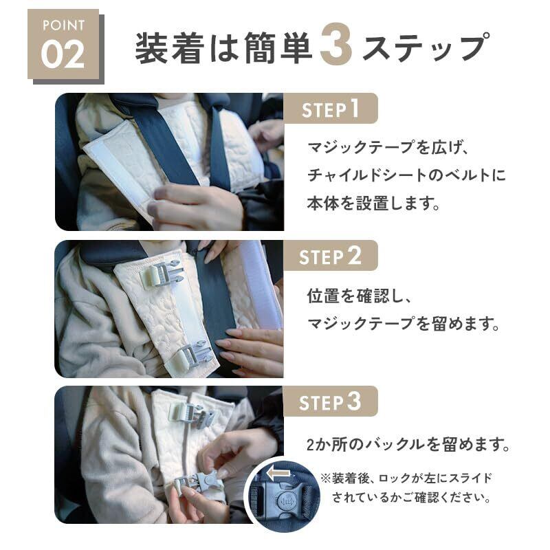【簡単3ステップで着用完了】1.マジックテープを広げ、チャイルドシートのベルトに本体を設置します。2.位置を確認し、マジックテープを留める。3.バックルを留め、ロックを左にスライドさせて完了です。