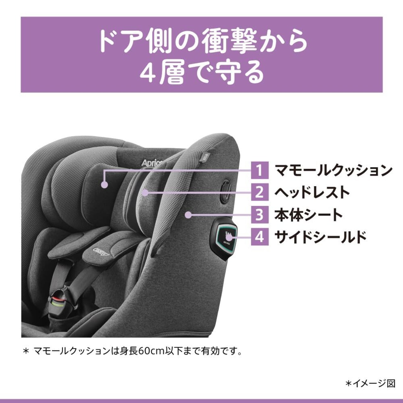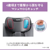 【4層で守る】マモールクッション、ヘッドレスト、本体シート、サイドシールドの4層で守る。衝撃吸収素材マシュマロGキャッチが4歳頃まで衝撃から頭を守る。
