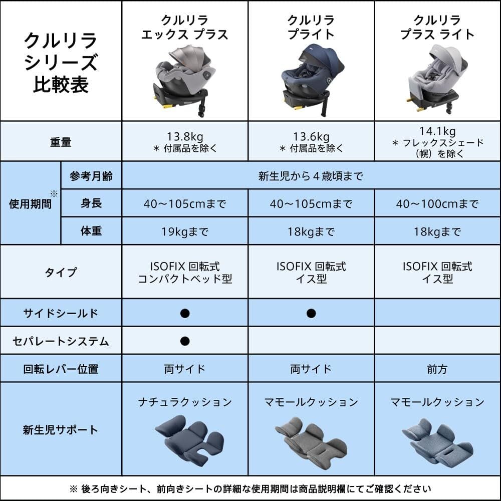 ●アップリカの「クルリラ プラス ライト」は、新生児から使えるISOFIX取付タイプの回転式チャイルドシートです。