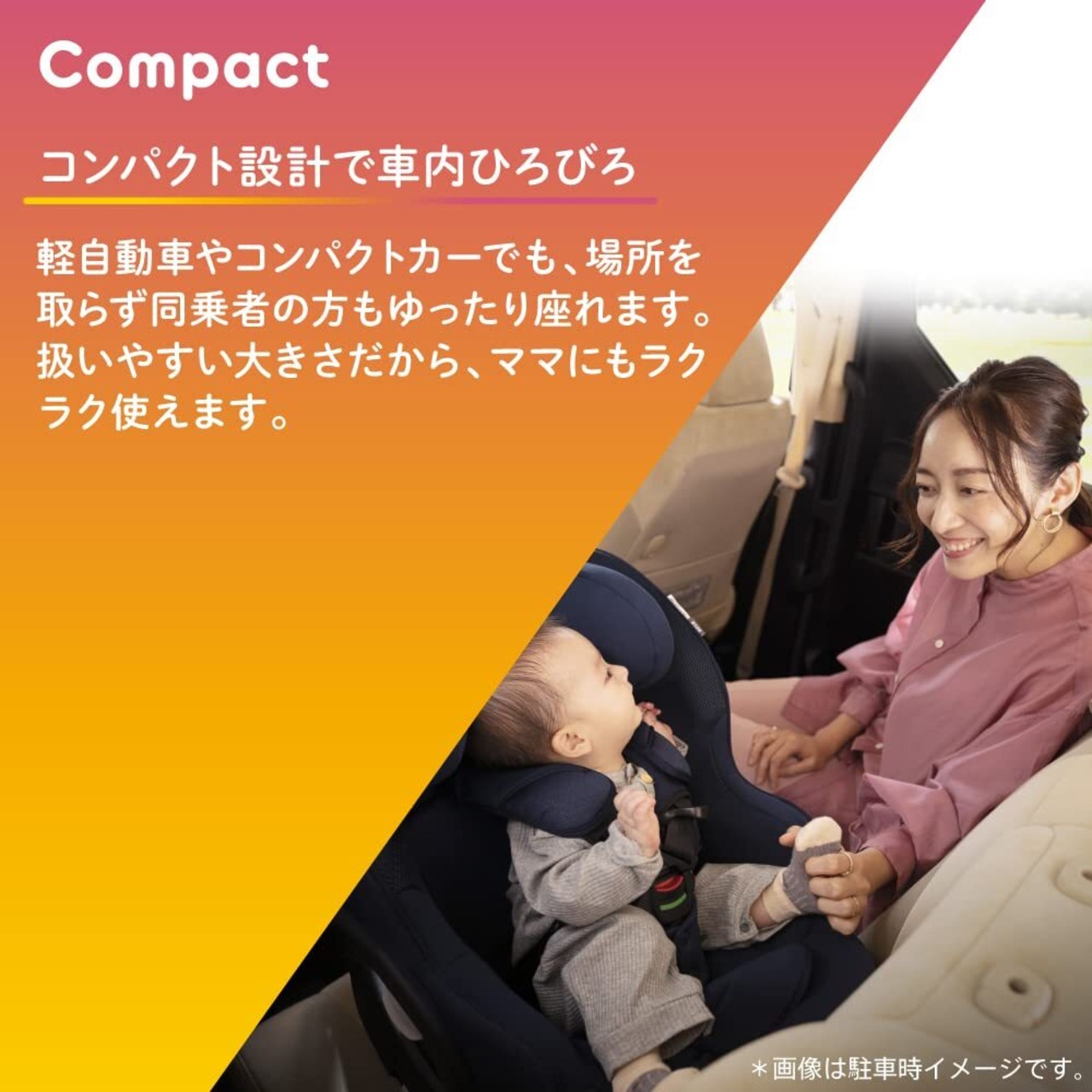 ●コンパクト設計の回転式チャイルドシートなので、軽自動車やコンパクトカーでも、場所を取らず同乗者の方もゆったり座れます。